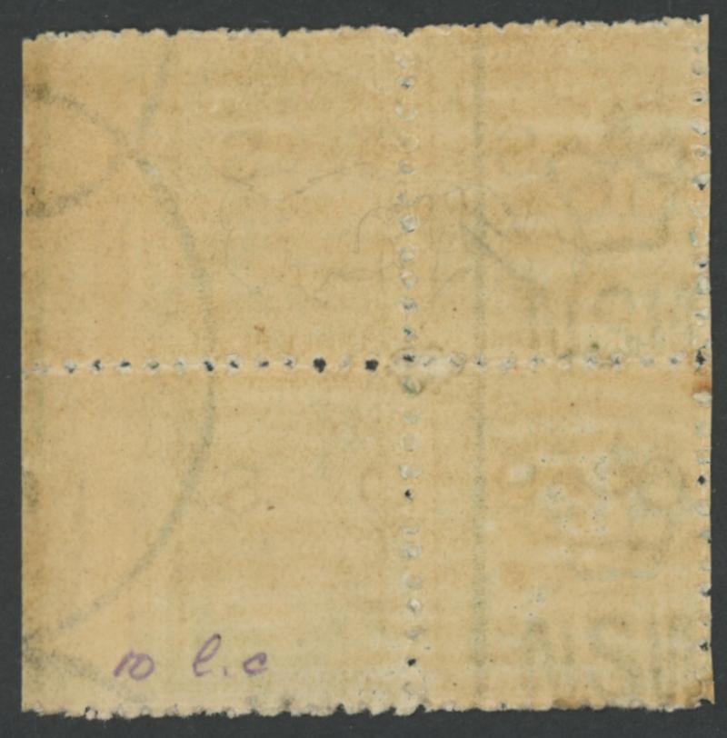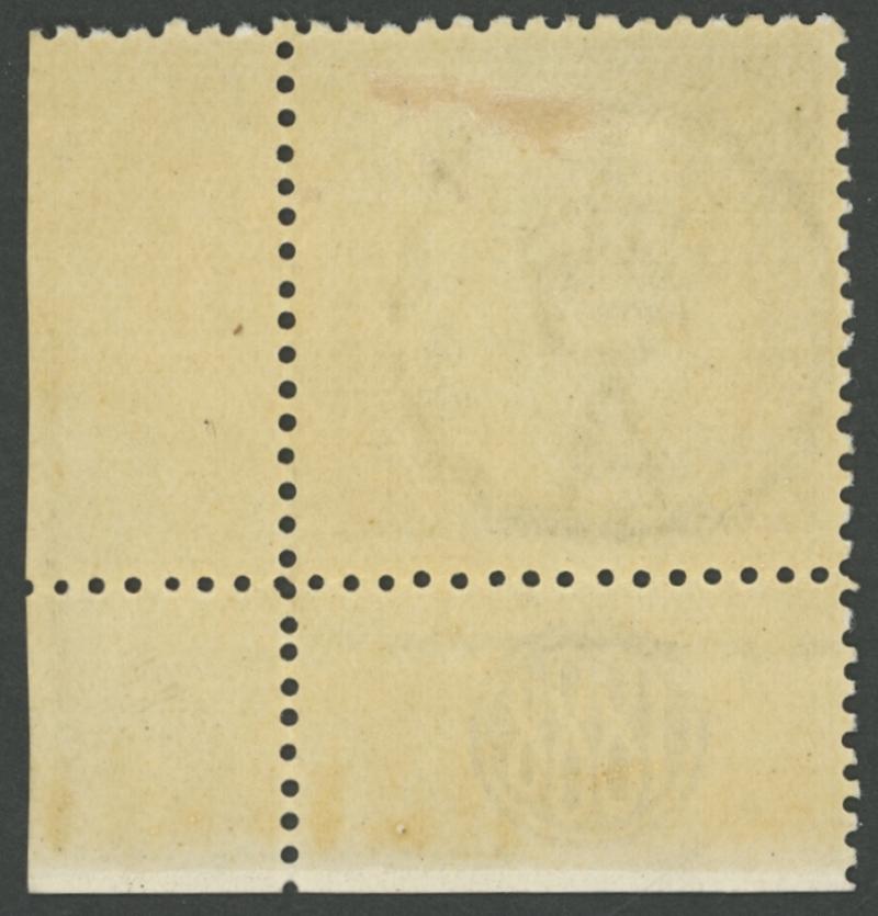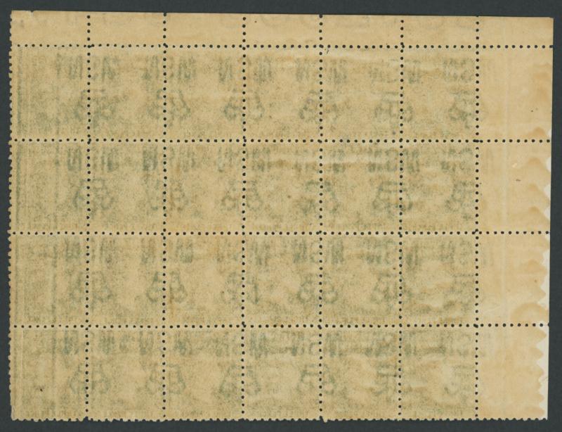 upper-left corner of the sheet with the Watermark Significantly Misplaced resulting in Crown/A in the upper margin only, the upper-left unit with Horizontal Watermark Line Only, the upper-right unit with Watermark Line & 'CO[MMONWEALTH]' Wmk, the