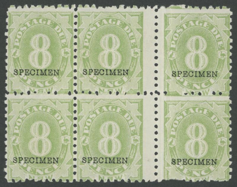 POSTAGE DUES: 1891-97 8d dull yellow-green SG D8 interpanneau block of 6 (3x2), several characteristic irregular perfs including