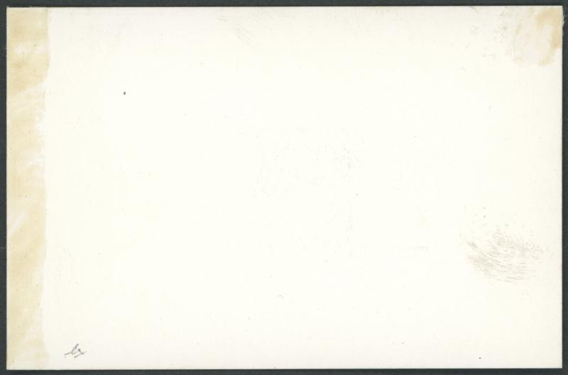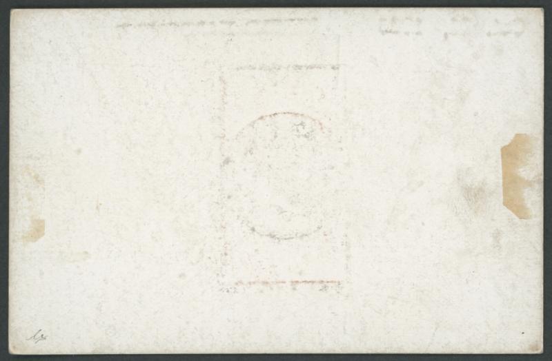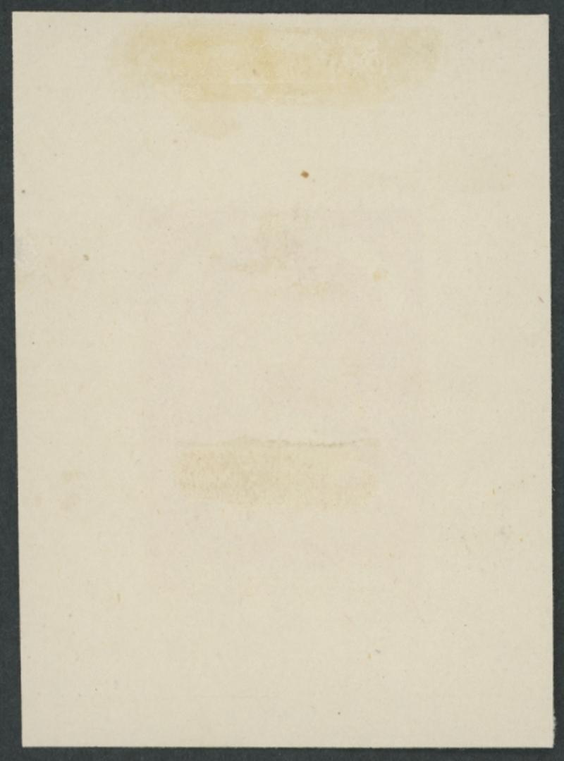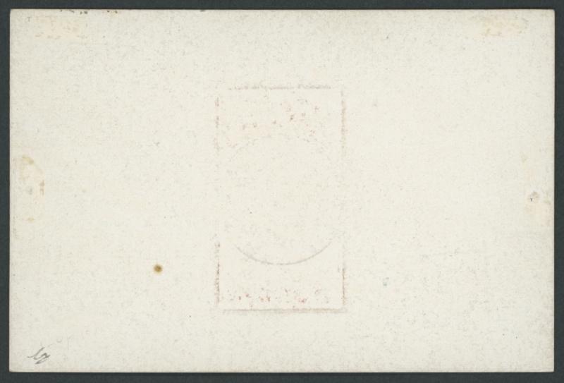 REPRINTS: Perkins Bacon Queen-on-Throne reprinted unfinished die proof with blank tablets in crimson on wove paper with enormous