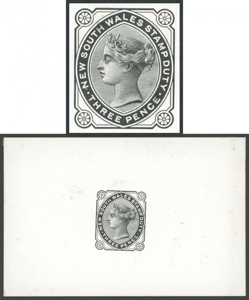REVENUES: 1865 Stamp Duty QV master die proof for the frame & central design in black on highly surfaced card (93x60mm) handstamped