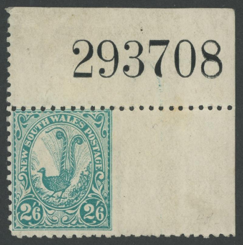 1905-10 Small Crown/A Watermark Lyrebird 2/6d blue-green Perf 11 as SG 349b corner example from the upper-right of the sheet