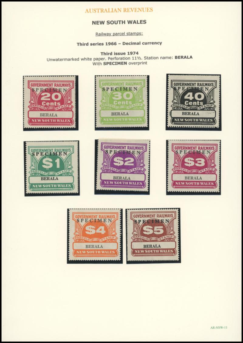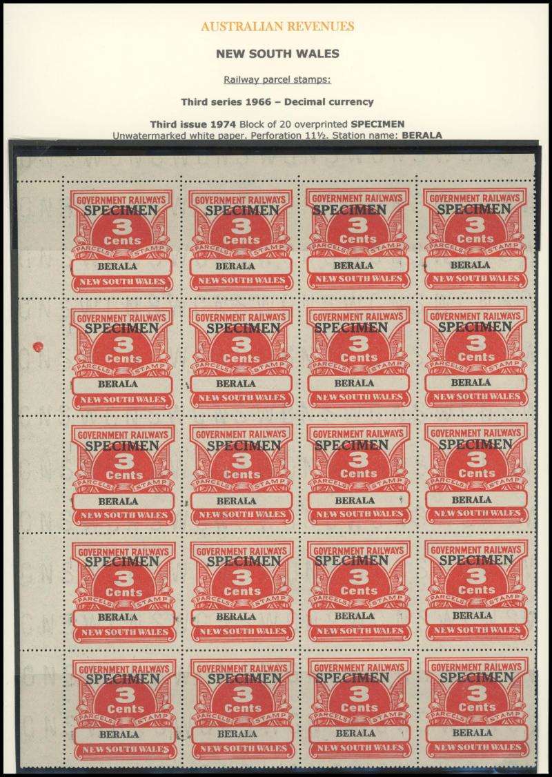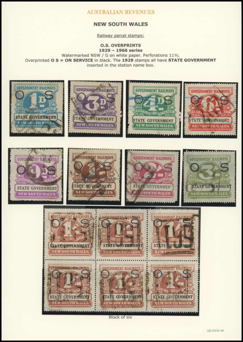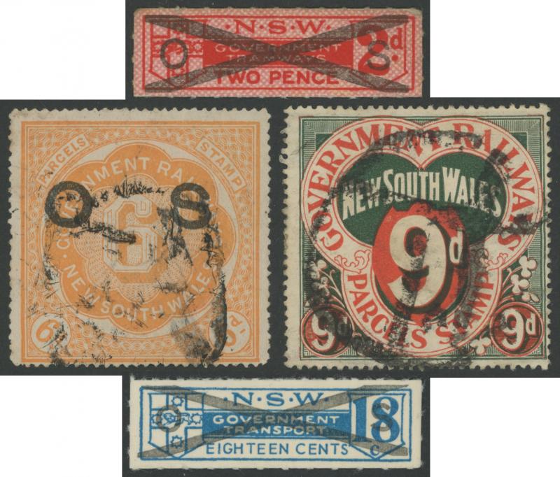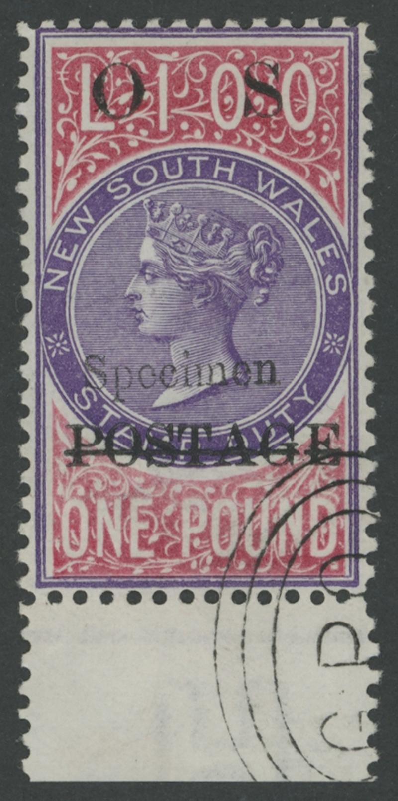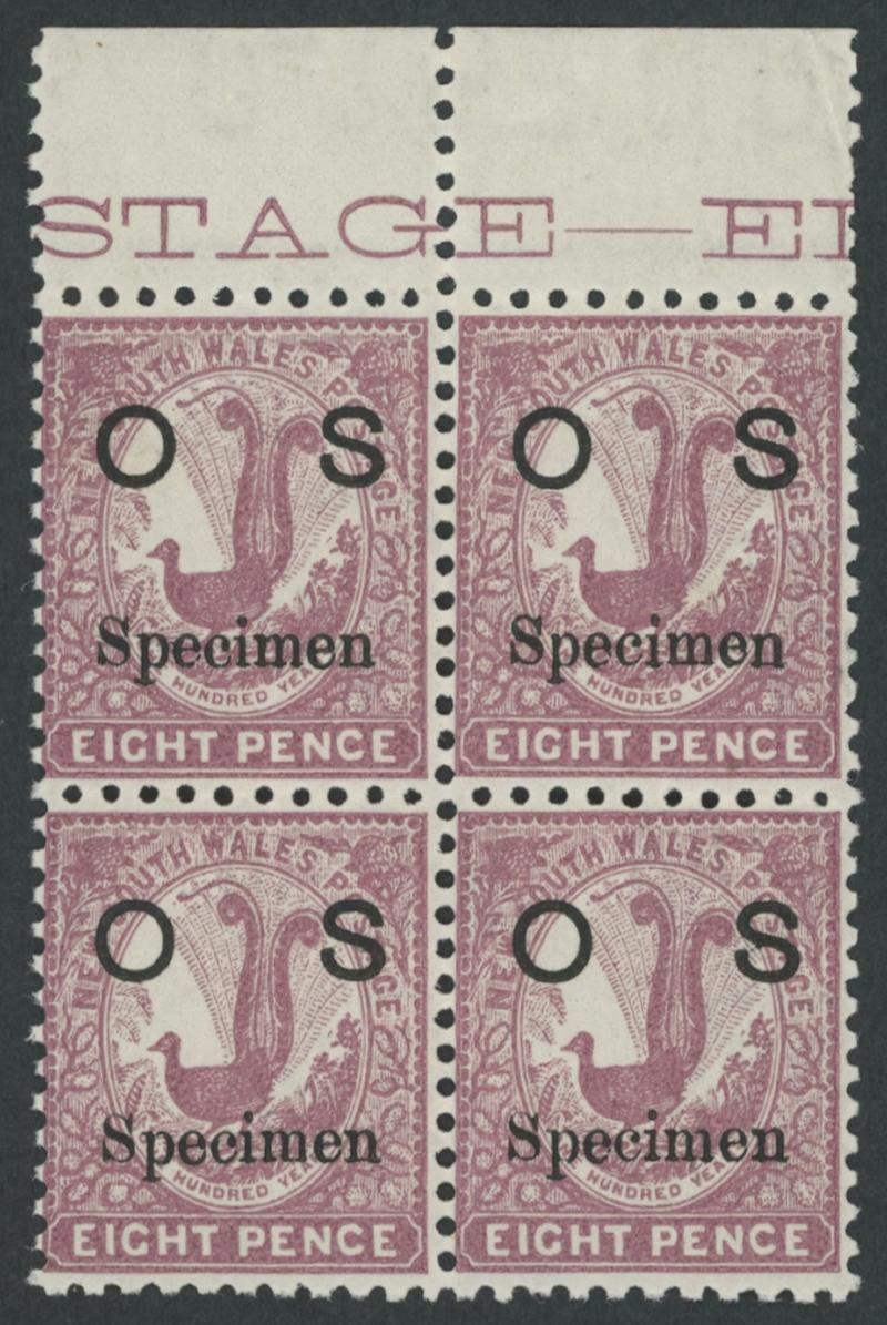 'OS' 10c used and 50c, 80c, $3 & $4 */** plus 'BERALA' overprinted 'SPECIMEN' 20c, 30c, 40c, $1, $2, $3, $4 & $5, plus 'N.S.W./ GOVERNMENT/TRAMWAYS' overprinted 'OS' 2d red and 18c blue both with 'X' overprints/cancels, etc, condition a little