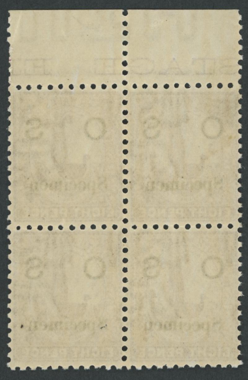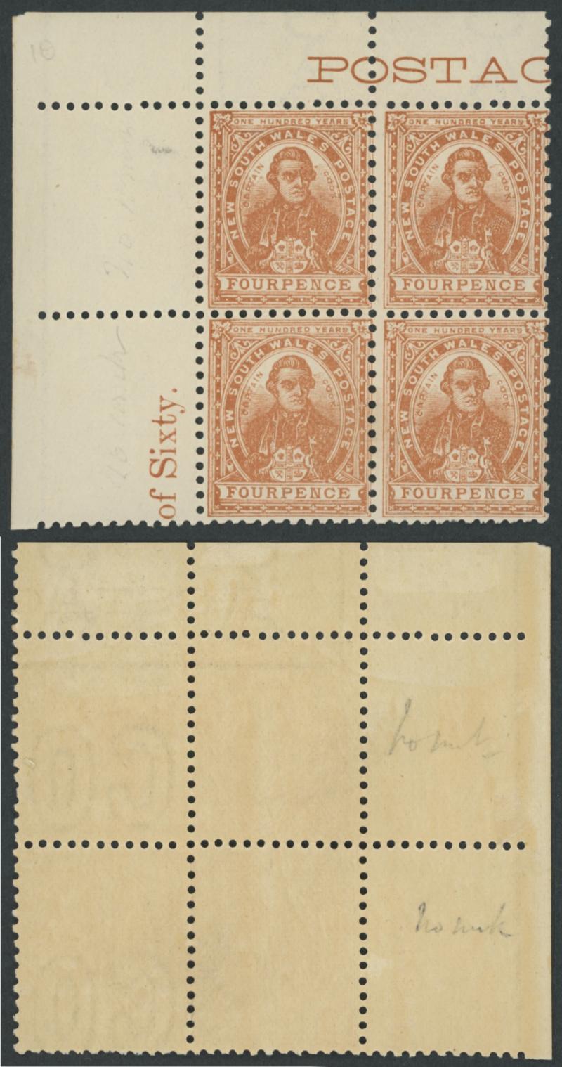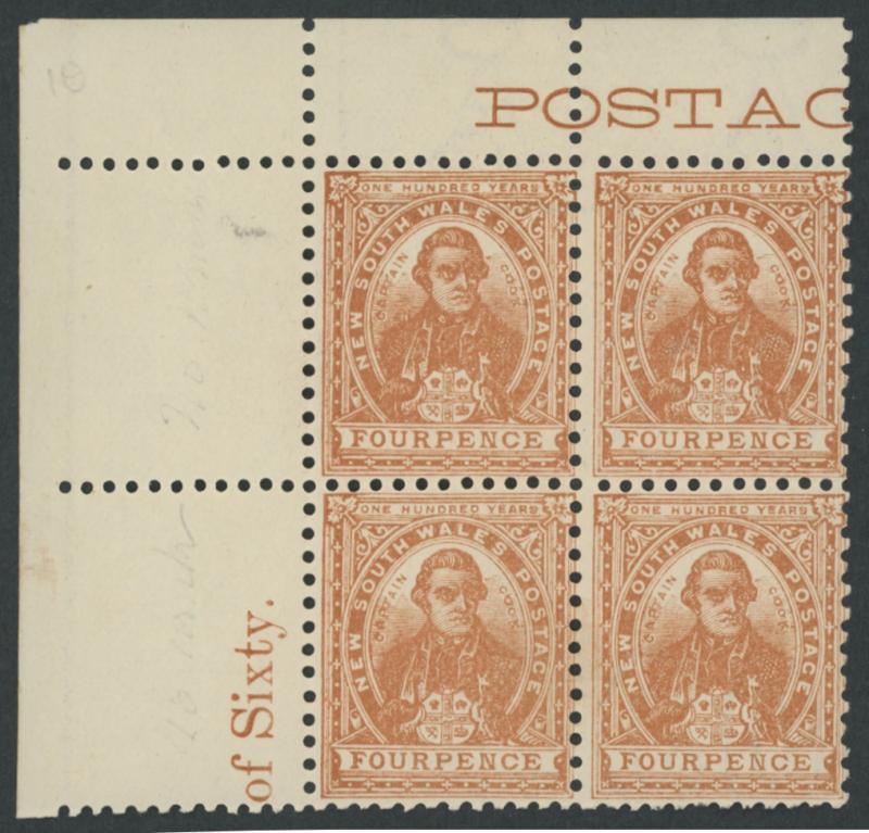 1907 Emergency Printings on Victorian Large Crown/A Watermark Paper 4d Captain Cook orange-brown SG 357 block of 4 from the