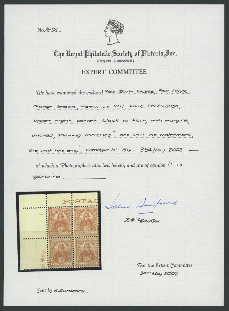 Evans: sold at our auction of 4.5.2002 for $1300 (Sale 96 Lot 270) and again at our auction of 24.1.2004 for $5660 (Sale 108 Lot 520). RPSV Certificate (2002) as the then SG 354. (Image1) (Image2)
