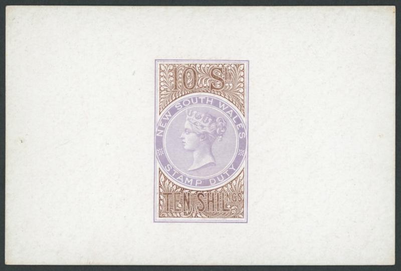 REVENUES: 1865 Stamp Duty QV 10/- bicoloured die proof in violet & brown on glazed card (92x61mm), tiny retaining-pinholes at the