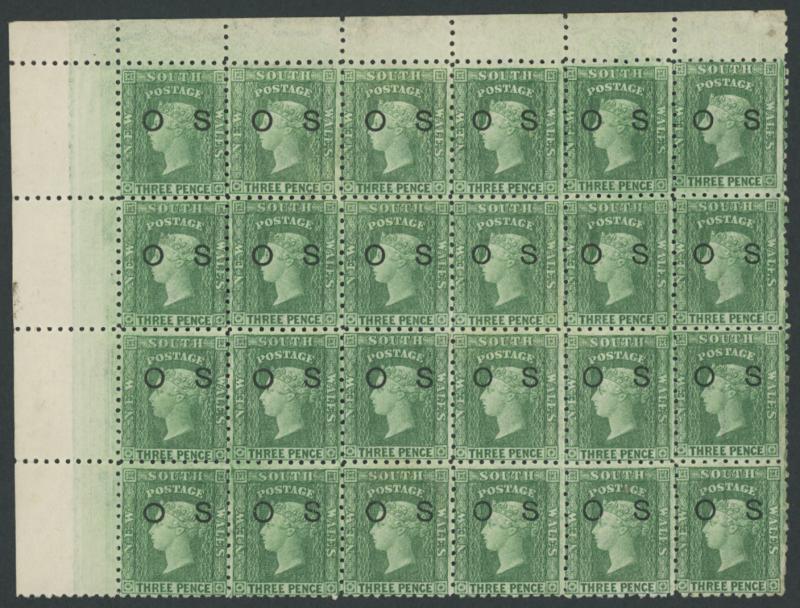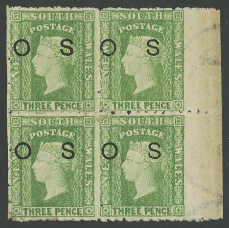 OFFICIAL STAMPS: 1882-85 Overprinted 'OS' QV Diadems Crown/NSW Watermark '40' Perf 10 3d yellow-green SG O22 marginal block of 4