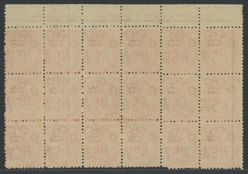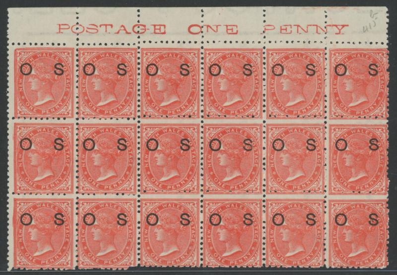 OFFICIAL STAMPS: 1882-85 Overprinted 'OS' QV Crown/NSW Watermark '40' De La Rue 1d scarlet Perf 11x12 SG O20b marginal block of 18