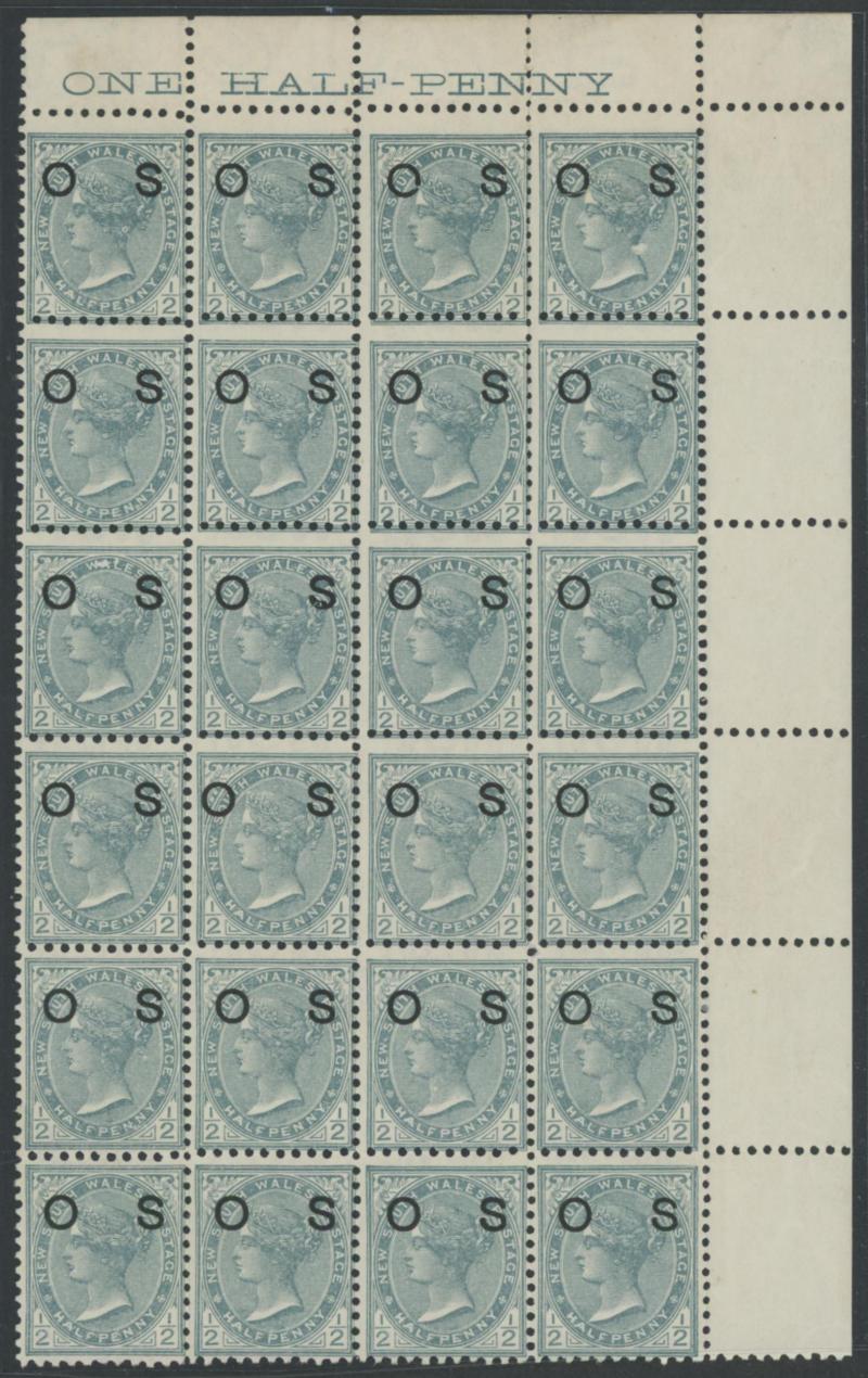 24 (4x6) with part-'ONE HALF-PENNY' Imprint; virtually full gum with most units being unmounted, Cat £780+ for mounted singles. Very scarce multiples. Ex John Bell (Goulburn): part of a larger lot.