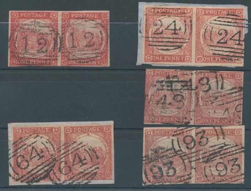 FORGERIES: Sydney Views 1d red by Jeffrys six pairs - three on small pieces - in various shades with forged Barred Numerals '12',