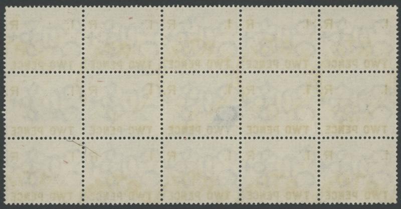 comprising 'TWO PENCE' x19 including horizontal pairs x2, 'THREE PENCE' x6, 'SIX PENCE' unused without gum, and 'FIVE POUNDS' * with some light discolouration, condition otherwise generally fine to very fine, Elsmore Online Cat $3,250+. Gibbons no