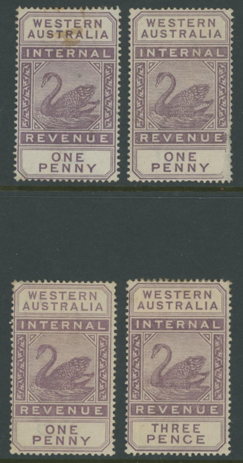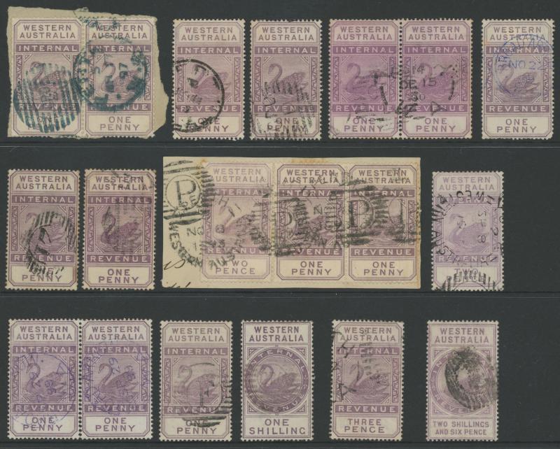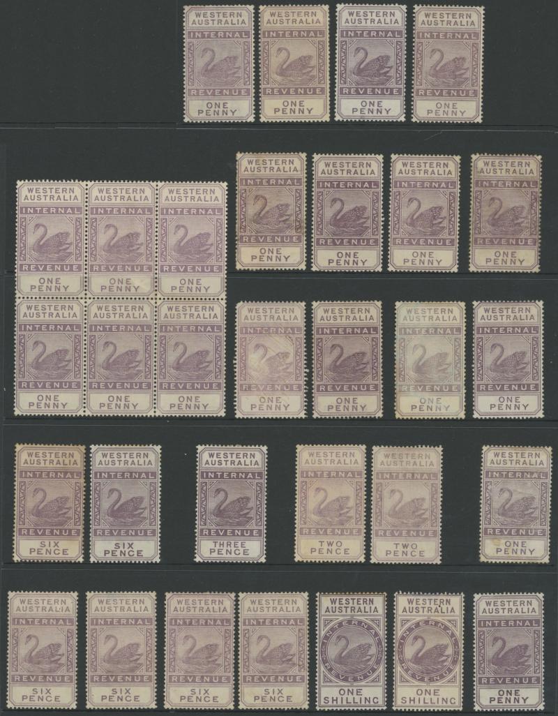 POSTAL FISCALS: 1881 'INTERNAL/REVENUE' Tall Swans selection comprising CA/Crown Wmk 1d x16 including a block of 6 (3x2), 2d x3,