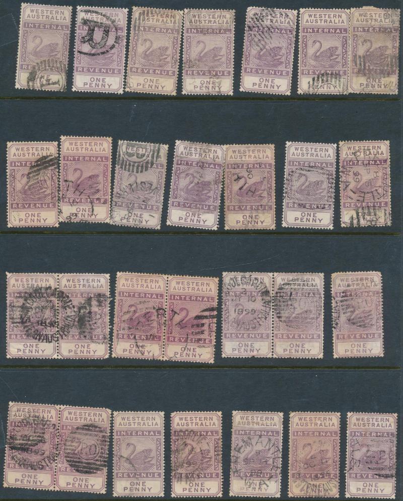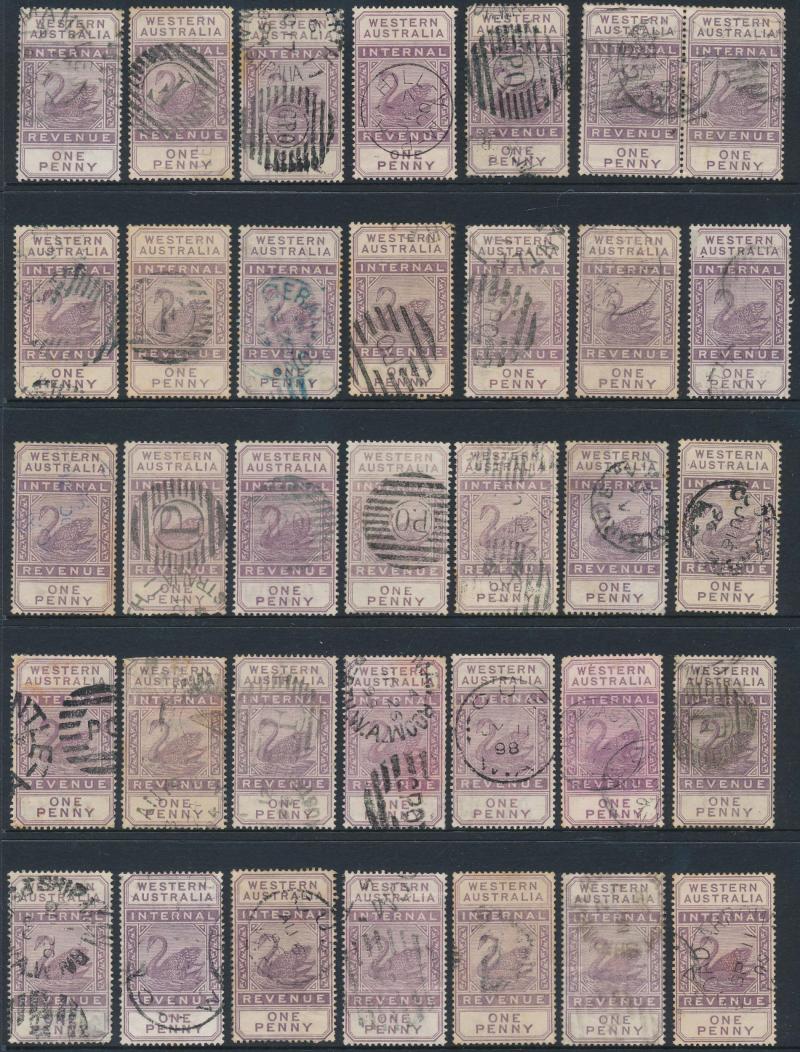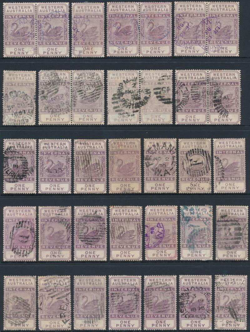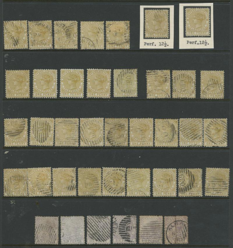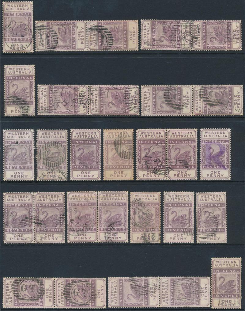 ARROW' cds in violet on 6d, '[KA]NOWNA - PO' duplex on 1d pair, 'MENZIES' cds on 3d, 'PEAK HILL' cds on 1/-, Barred Numerals '10' & '23' both on 1d singles, Barred Letters 'B' and 'GT' both on 1d pairs, etc, condition a little mixed but most are fine