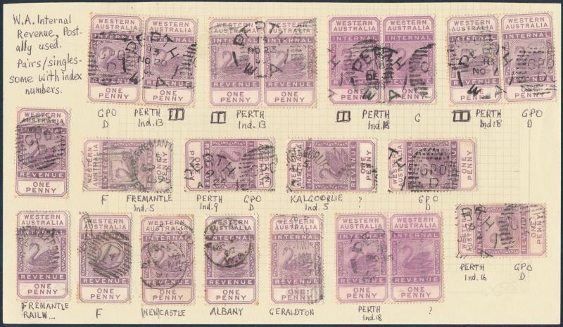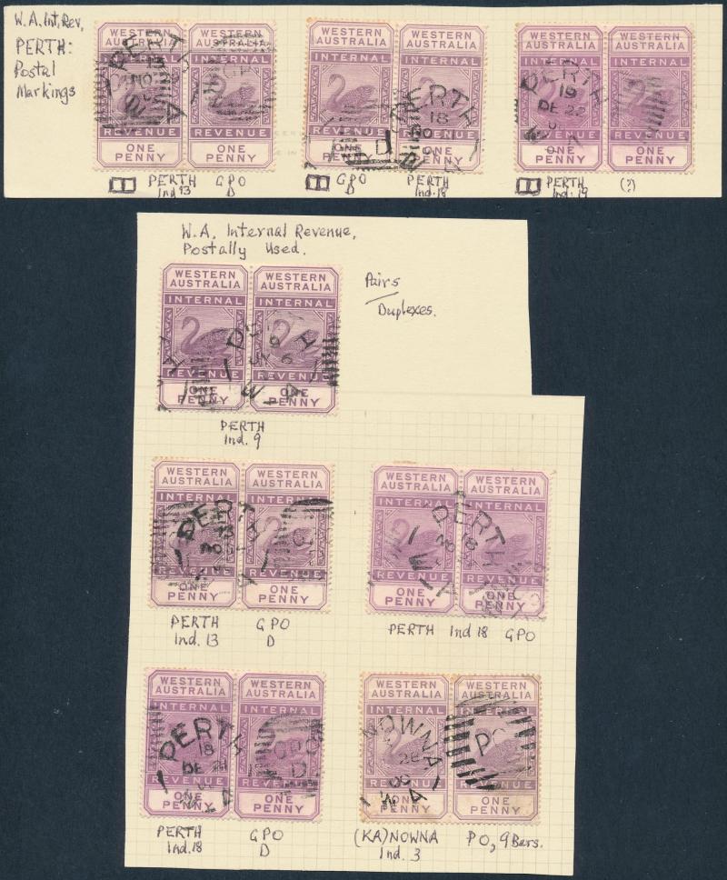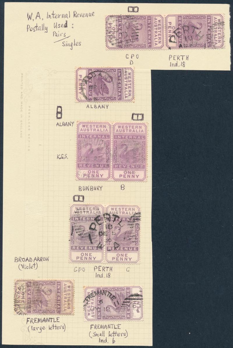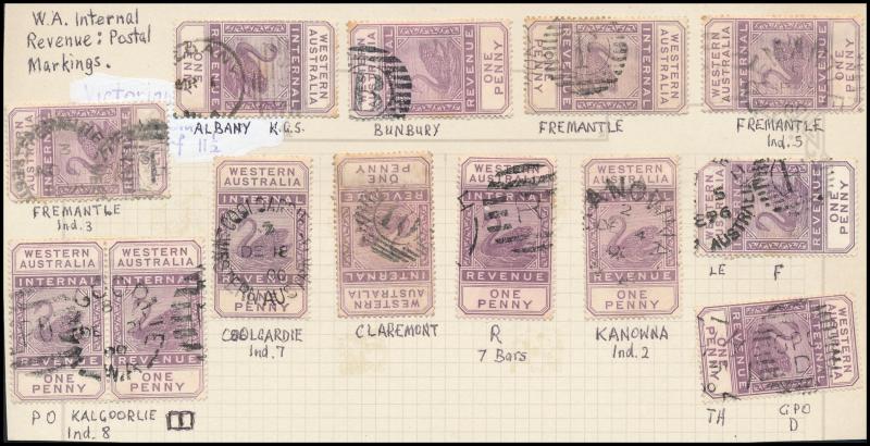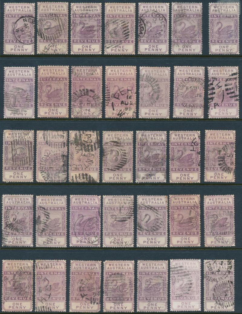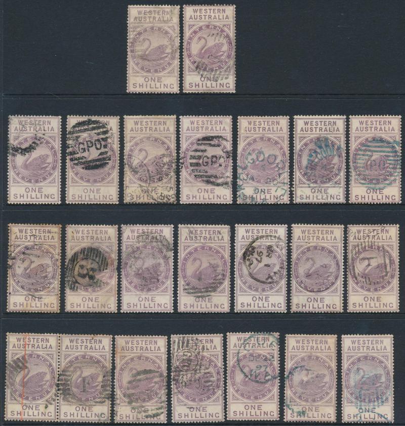 ARROW' cds in violet on 6d, '[KA]NOWNA - PO' duplex on 1d pair, 'MENZIES' cds on 3d, 'PEAK HILL' cds on 1/-, Barred Numerals '10' & '23' both on 1d singles, Barred Letters 'B' and 'GT' both on 1d pairs, etc, condition a little mixed but most are fine