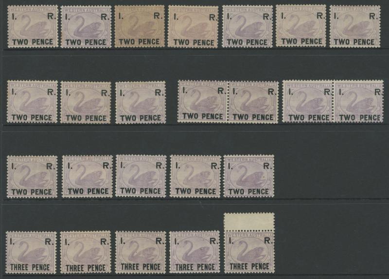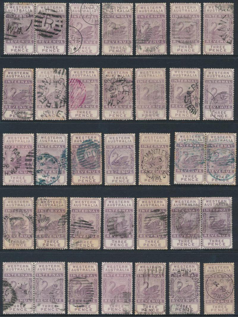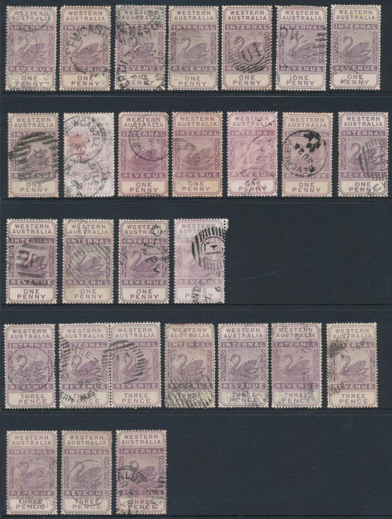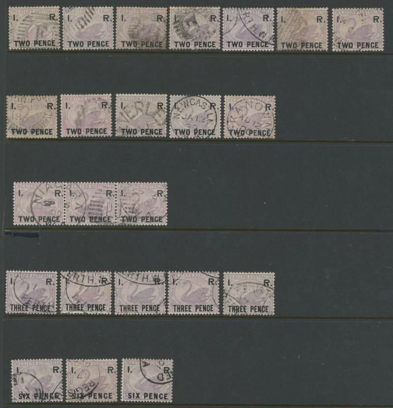 selection comprising 'TWO PENCE' x19 including a block of 4 with 'F'-in-Bars cancels, a strip of 3 with virtually complete 'NIAGARA/W.A - P.O.' duplex cancel, and singles with very fine 'NEWCASTLE' & 'KANOWNA' cds cancels, 'THREE PENCE' x7 including