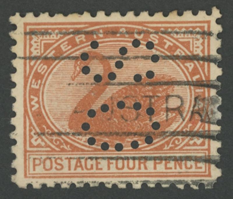 OFFICIAL STAMPS: 1905-12 Swans Crown/Double-Lined A Watermark Perf 11 4d yellow-brown SG 154 punctured 'OS' ACSC W39Ab,