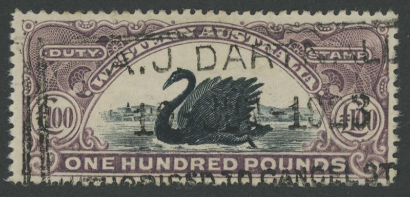 DUTY STAMP: 1904 Swan Bicolours Waterlow Printings W[Crown]A Type 5 Wmk £100 black & deep dull purple Dzelme R71 (RRR), light