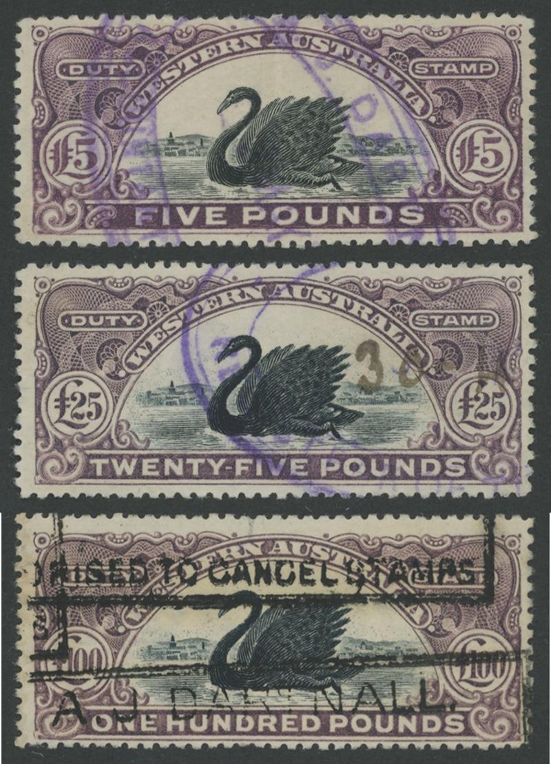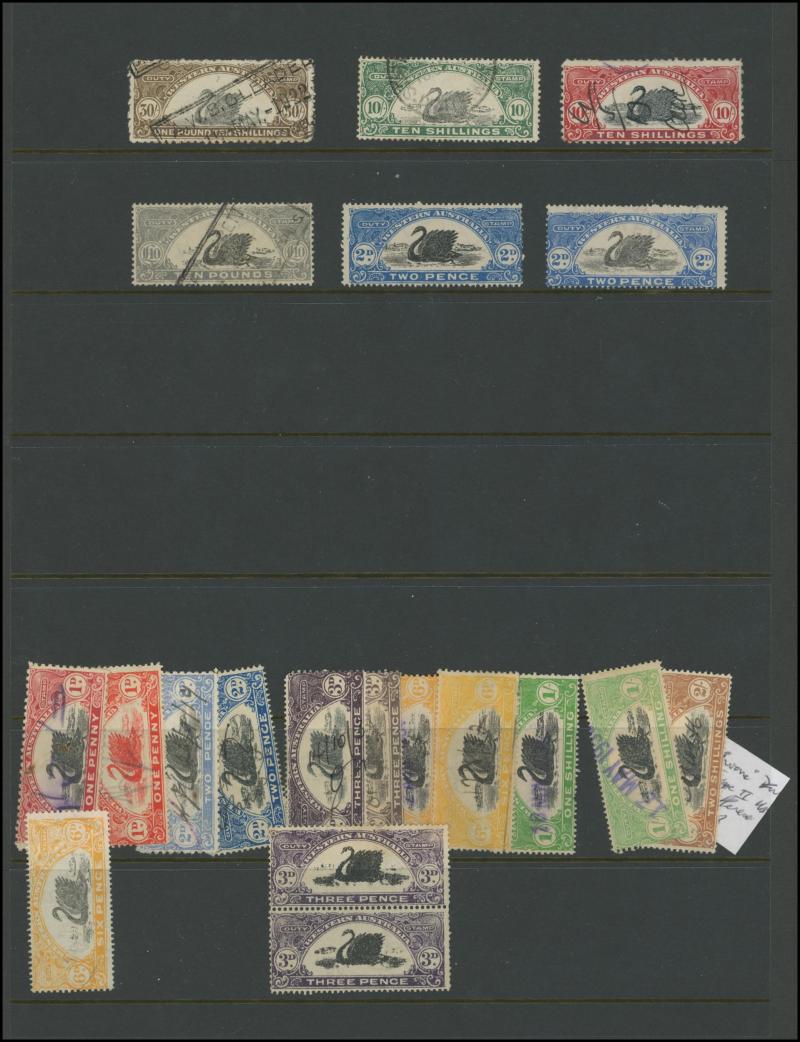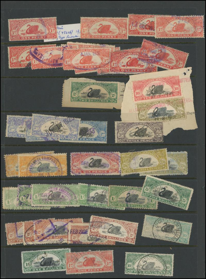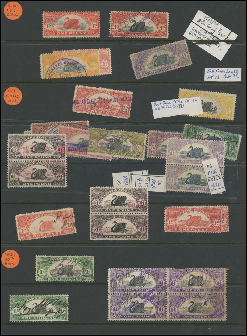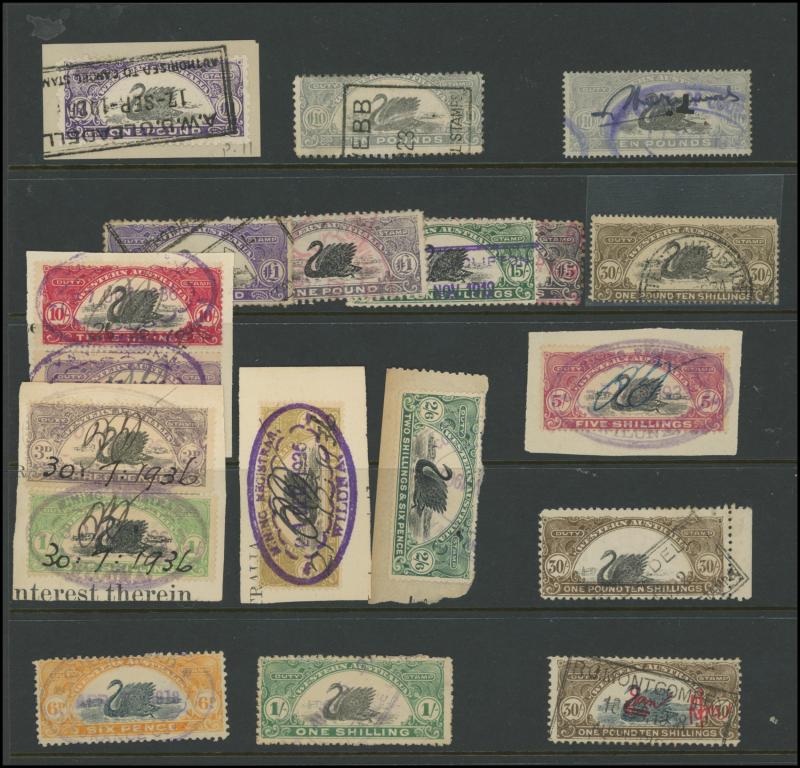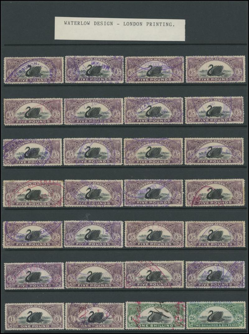 DUTY STAMP: Swans used accumulation including Waterlow Printings set to £100 (ex £50) with plenty of extras including £5 x24, £25