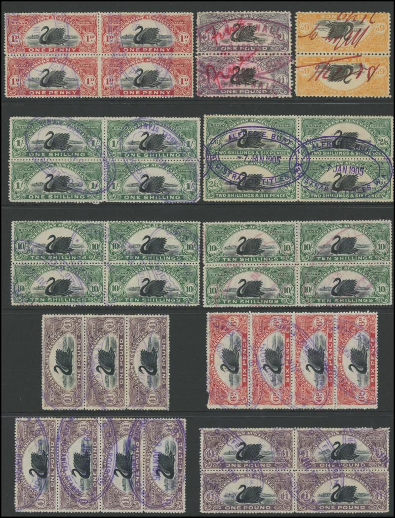 DUTY STAMP: 1904 Swan Bicolours Waterlow Printings W[Crown]A Type 5 Wmk £1 black & deep dull purple Dzelme R65 blocks of 4 x2 both
