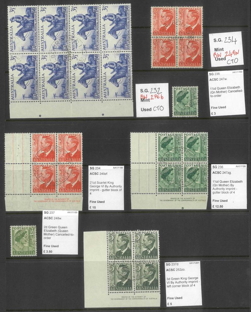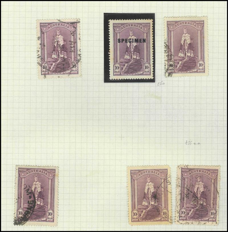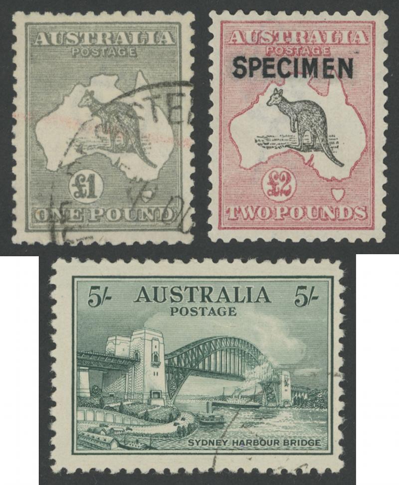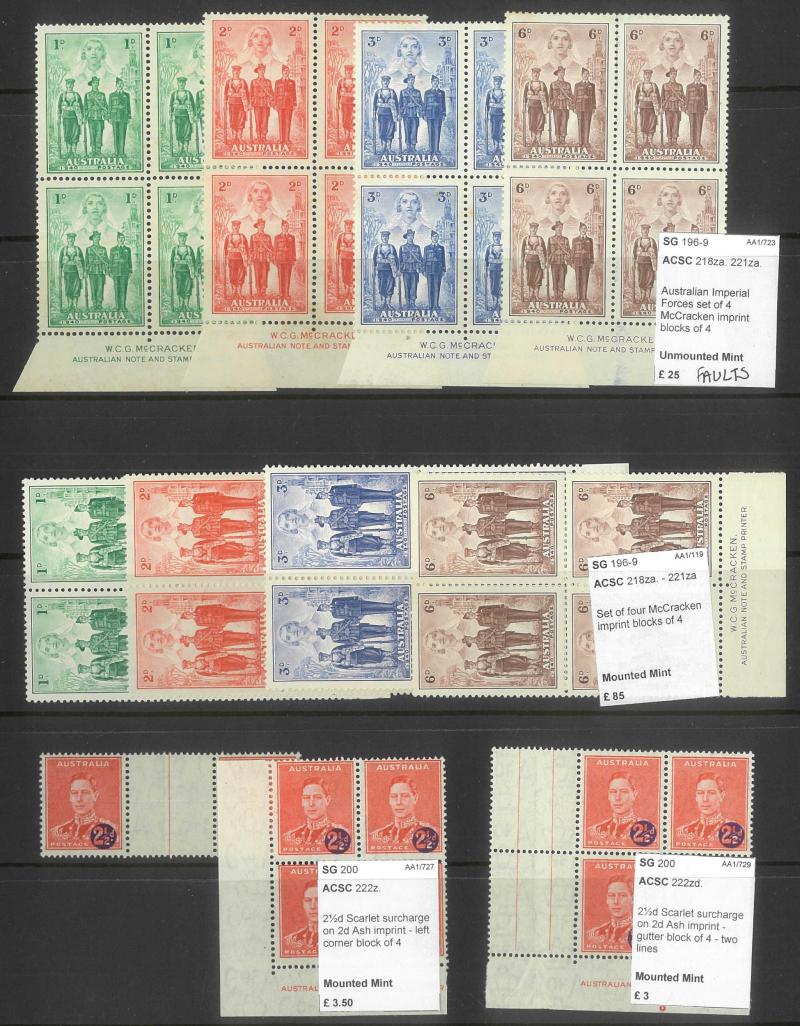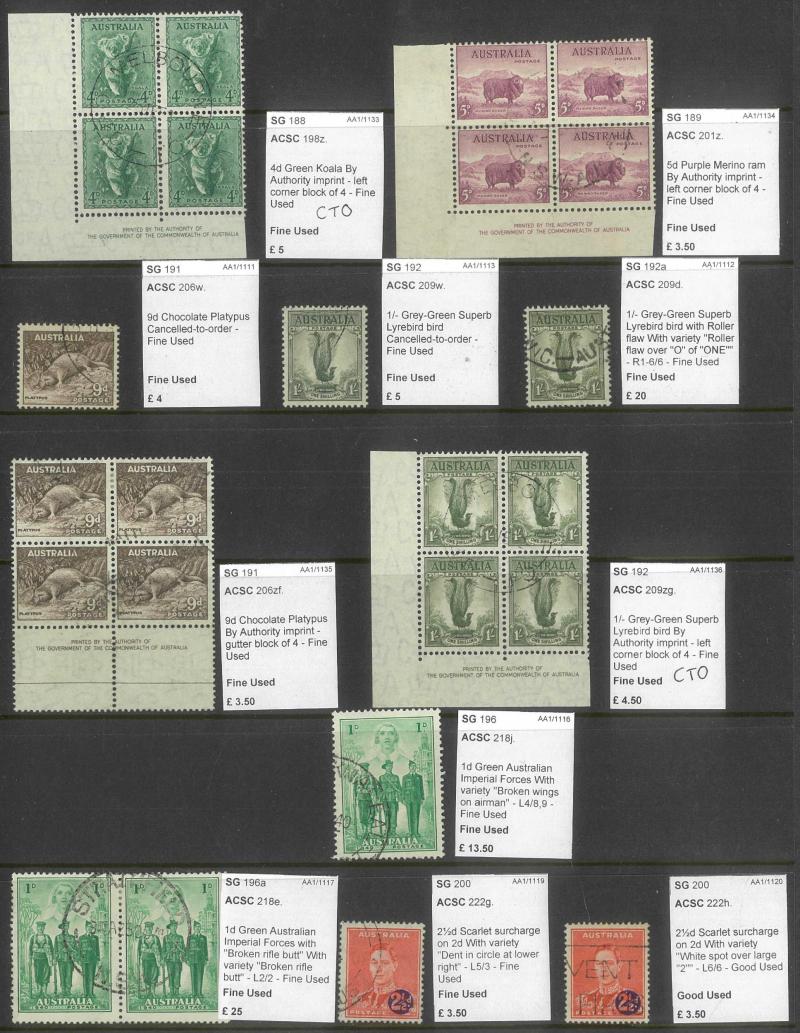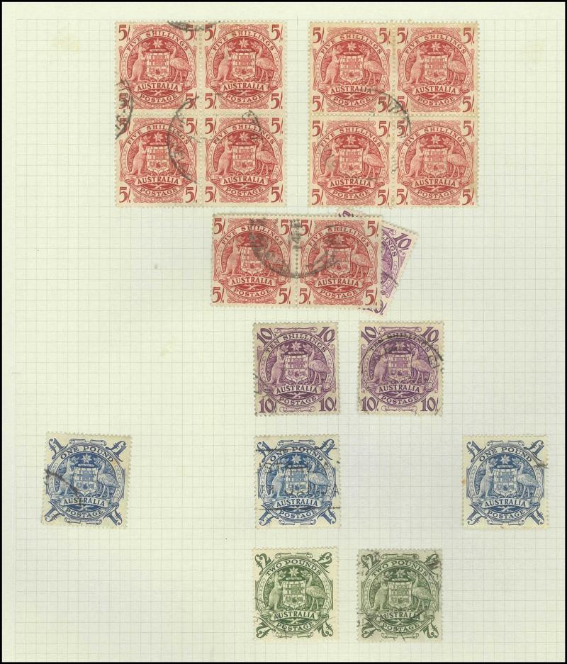 SMulti Wmk used, £1 and £2 CofA Wmk used plus 'SPECIMEN' set of 3, Kooka M/sheets one with red Exhibition cancel, 5/- Bridge both CTO and commercially used, Arms set used, KGVI period with many Imprint blocks as well as No Imprint blocks including