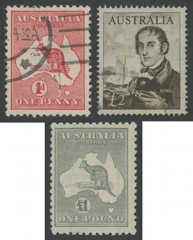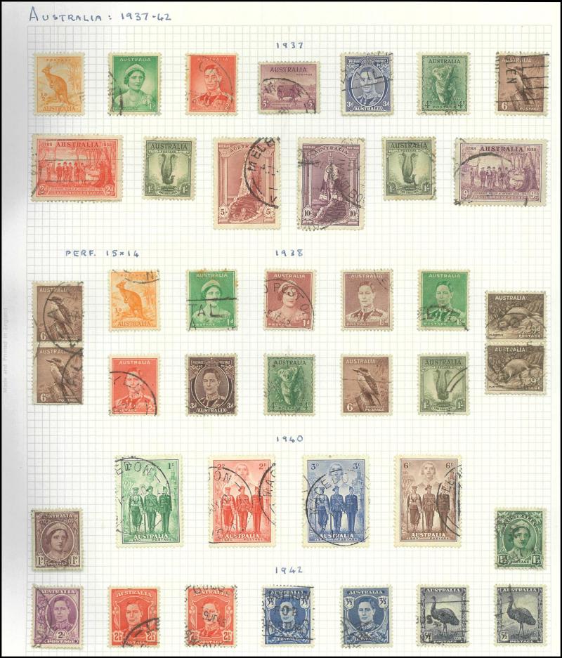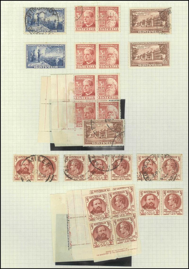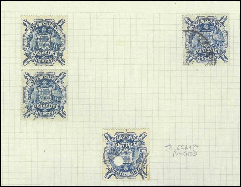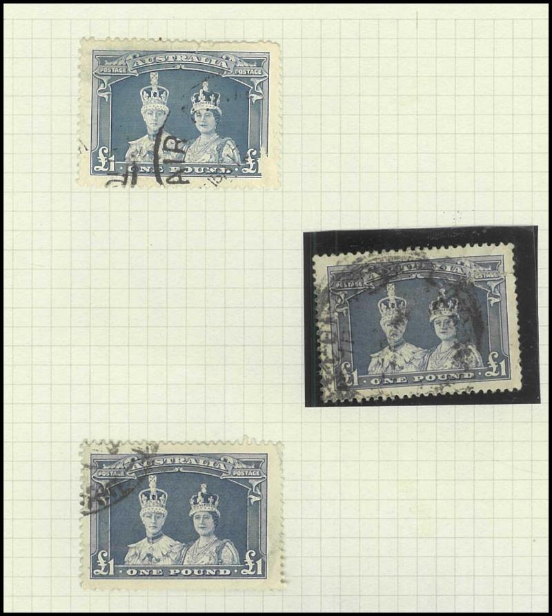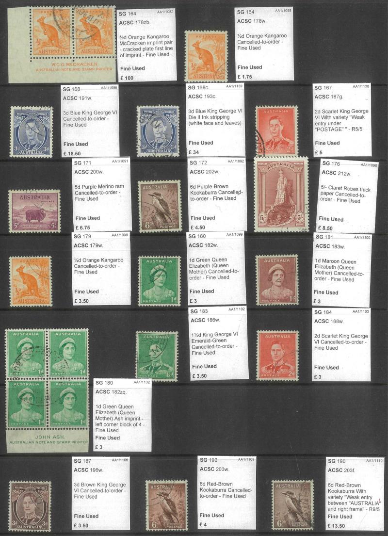 SMulti Wmk used, £1 and £2 CofA Wmk used plus 'SPECIMEN' set of 3, Kooka M/sheets one with red Exhibition cancel, 5/- Bridge both CTO and commercially used, Arms set used, KGVI period with many Imprint blocks as well as No Imprint blocks including