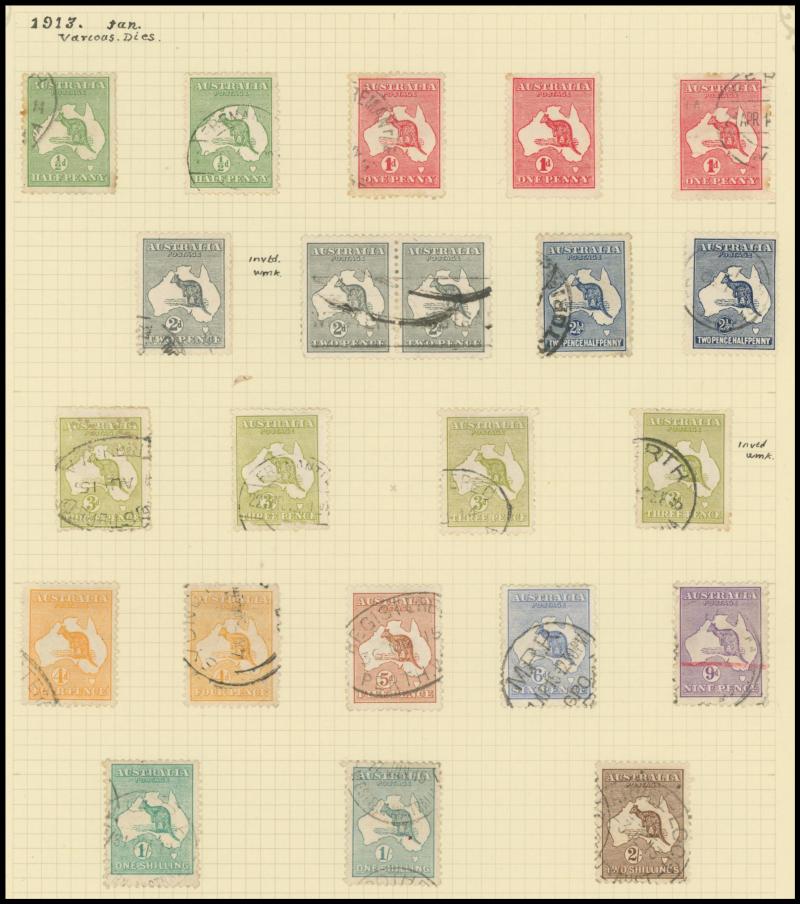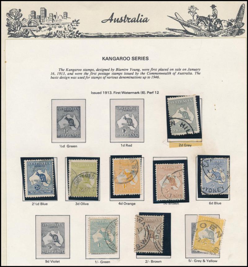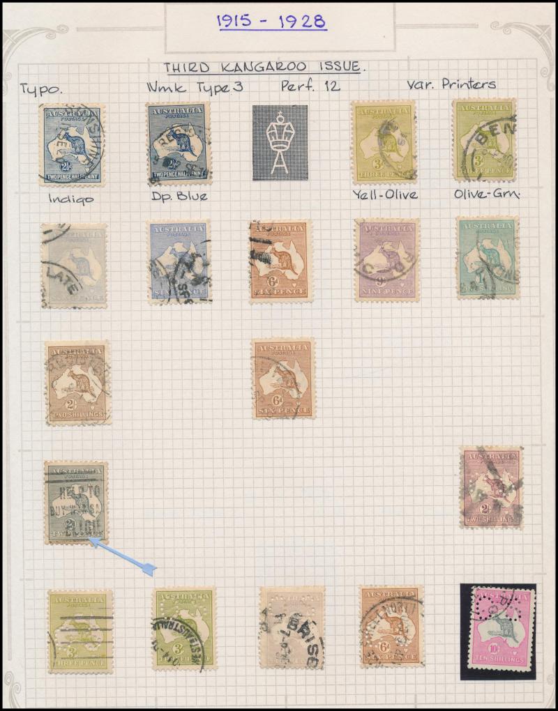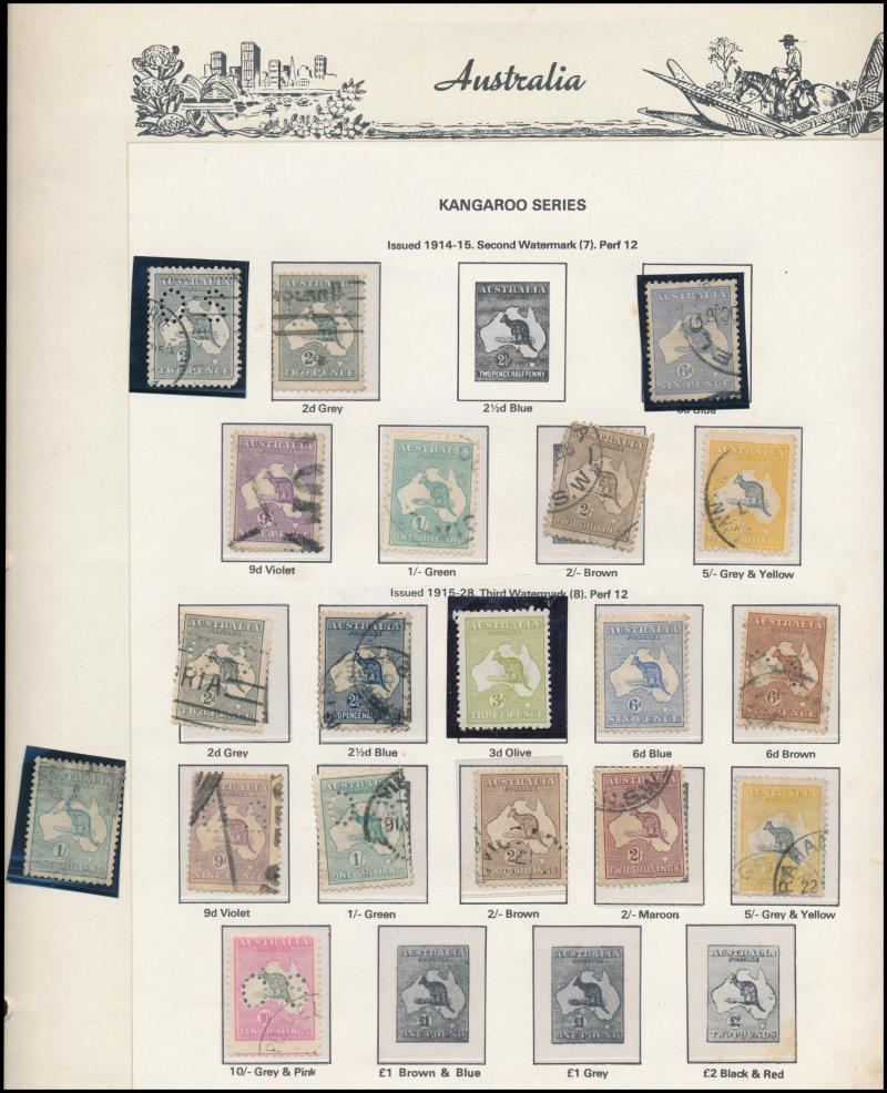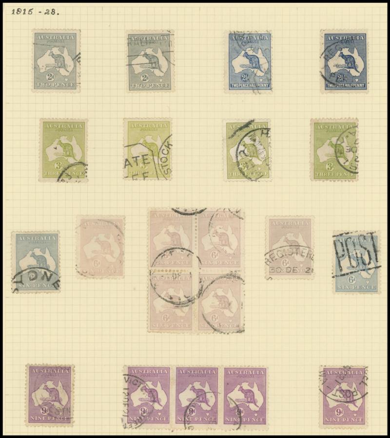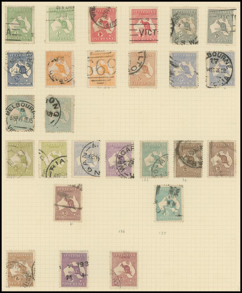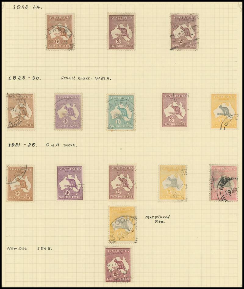 Modest collection with Kangaroos First Wmk to 2/- including selection of 1d varieties, Second Wmk to 2/-, Third Wmk 6d pale