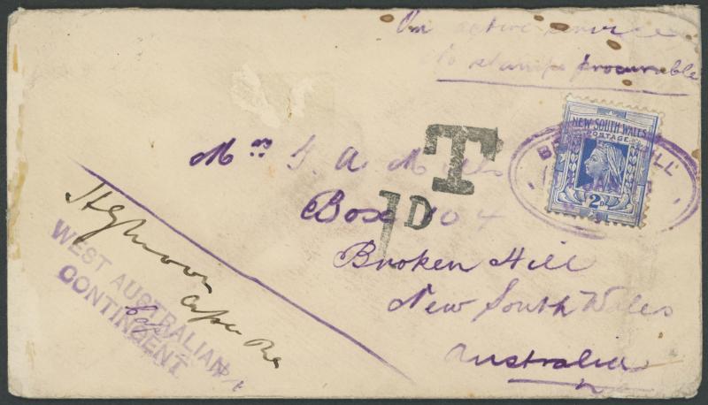 Active Service/No stamps procurable" & countersigned "HG Moor/Captn the" over the very rare 'WEST AUSTRALIAN/CONTINGENT' handstamp in violet, South African 'T' & '1D' handstamps signifying postage due of the 1d deficiency only but on arrival the fee