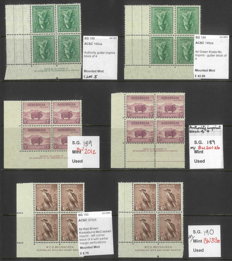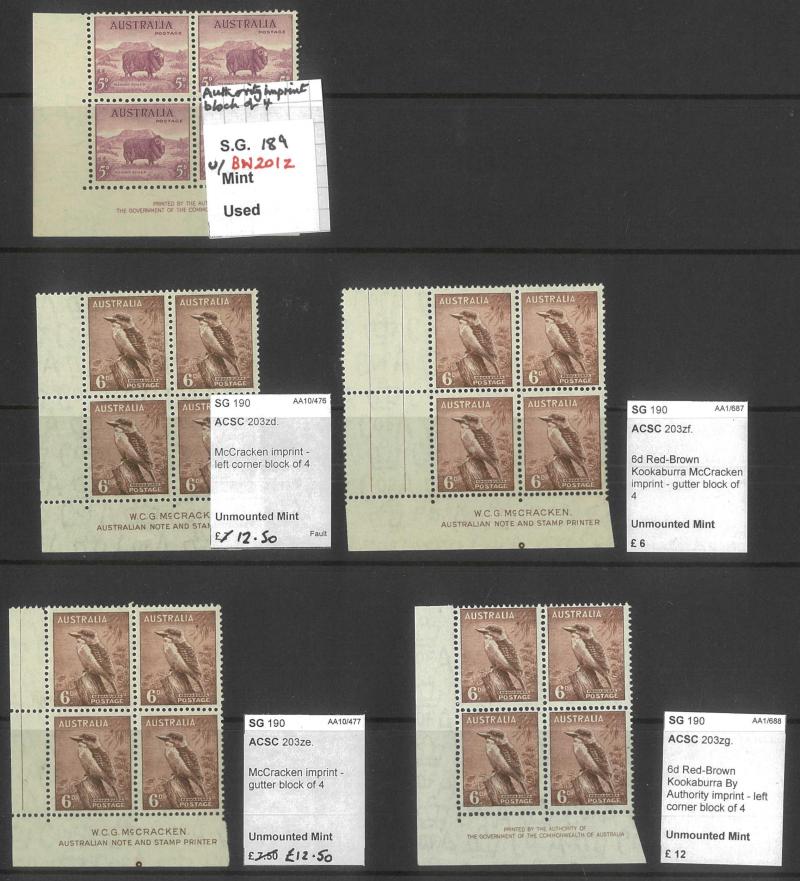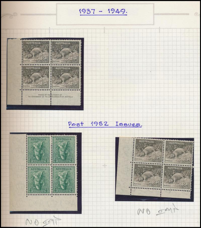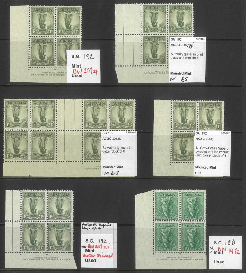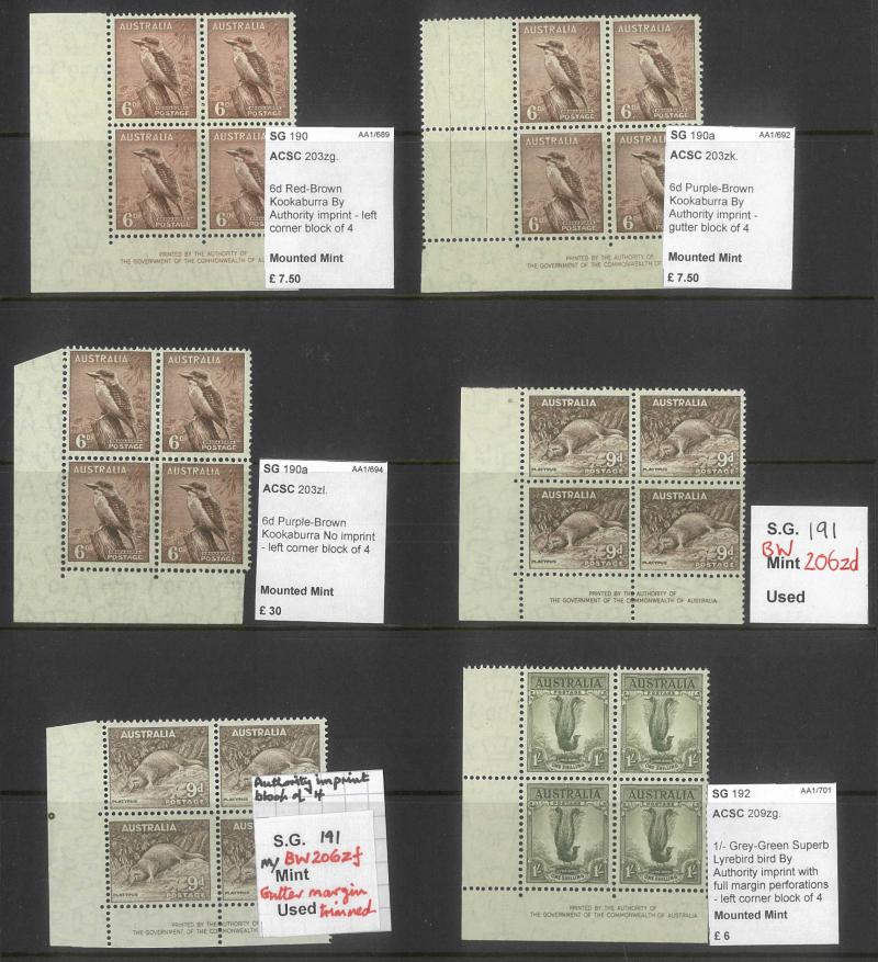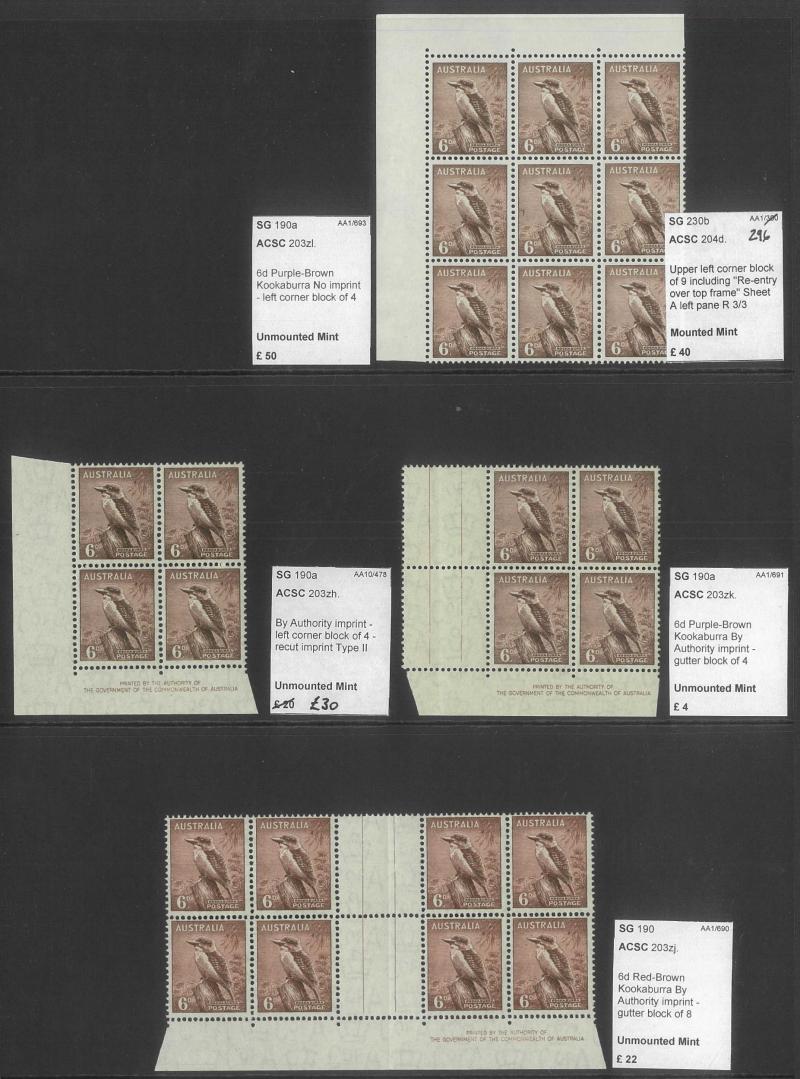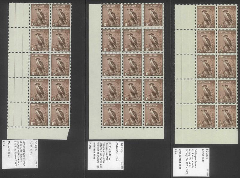 15x14 Left pane No Imprint block of 4 203zl ** as well as Recut Imprint type II block of 4 203zh **; 6d Kookaburra No Wmk block of 15 (5x3) with Re-Entry between Top Frame and First Shading Line 204i and j *; 9d Platypus perf 15x14 upper and lower
