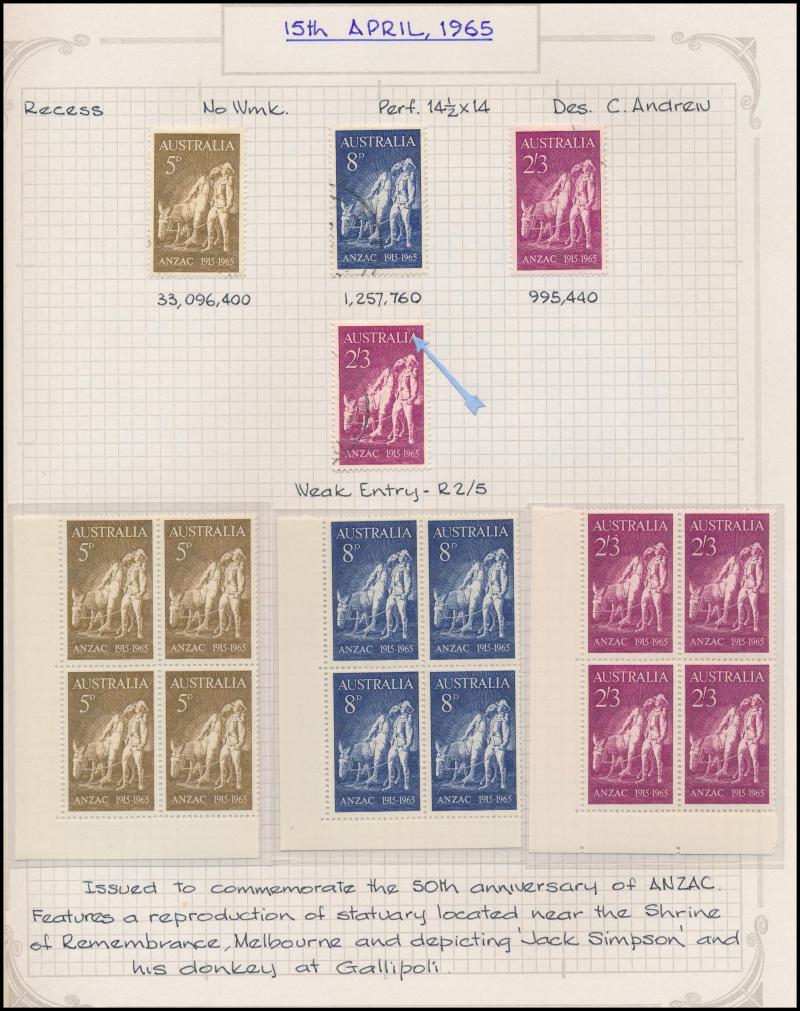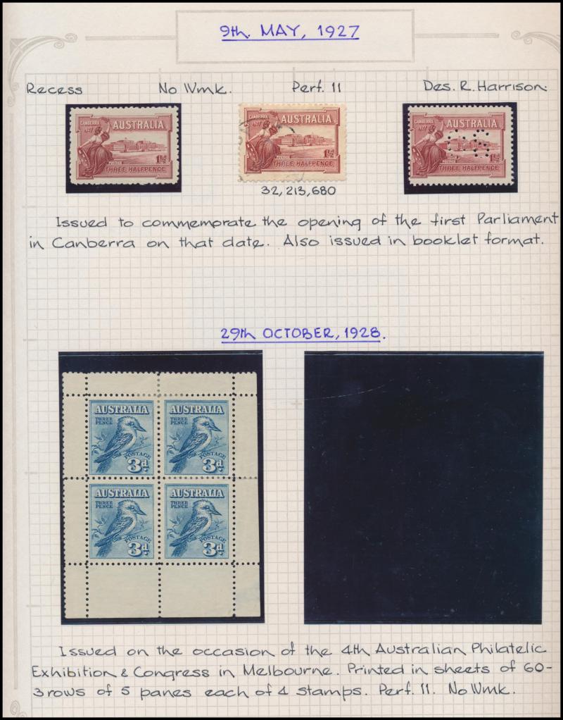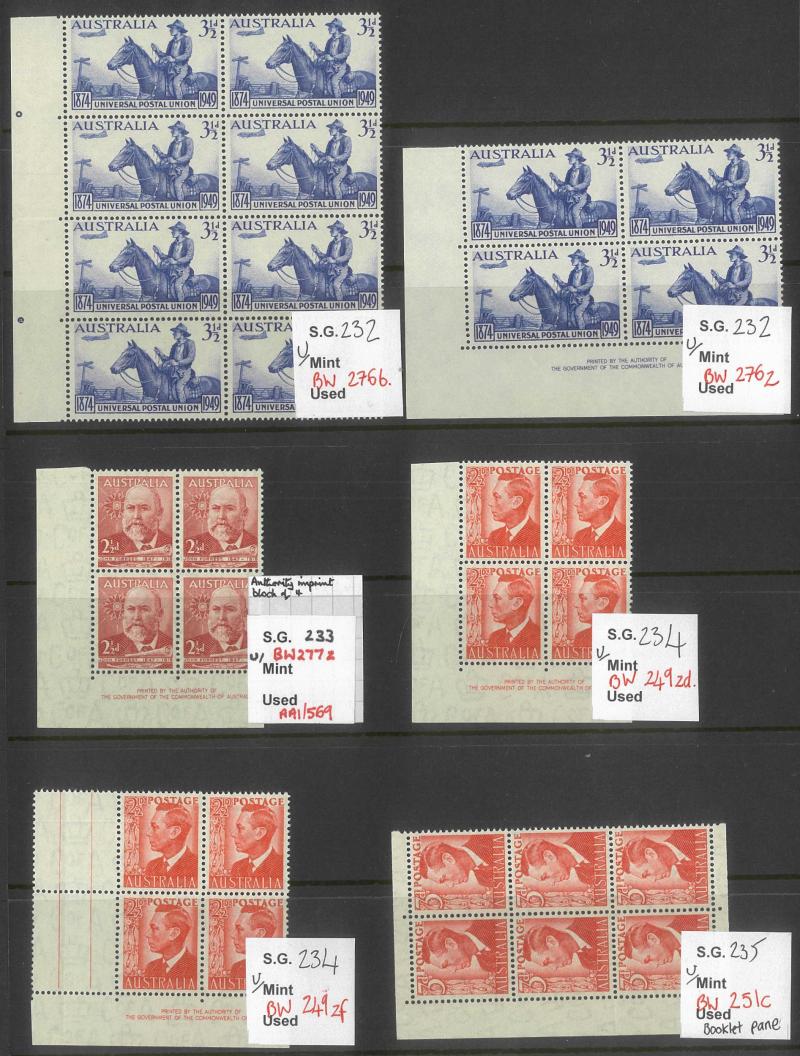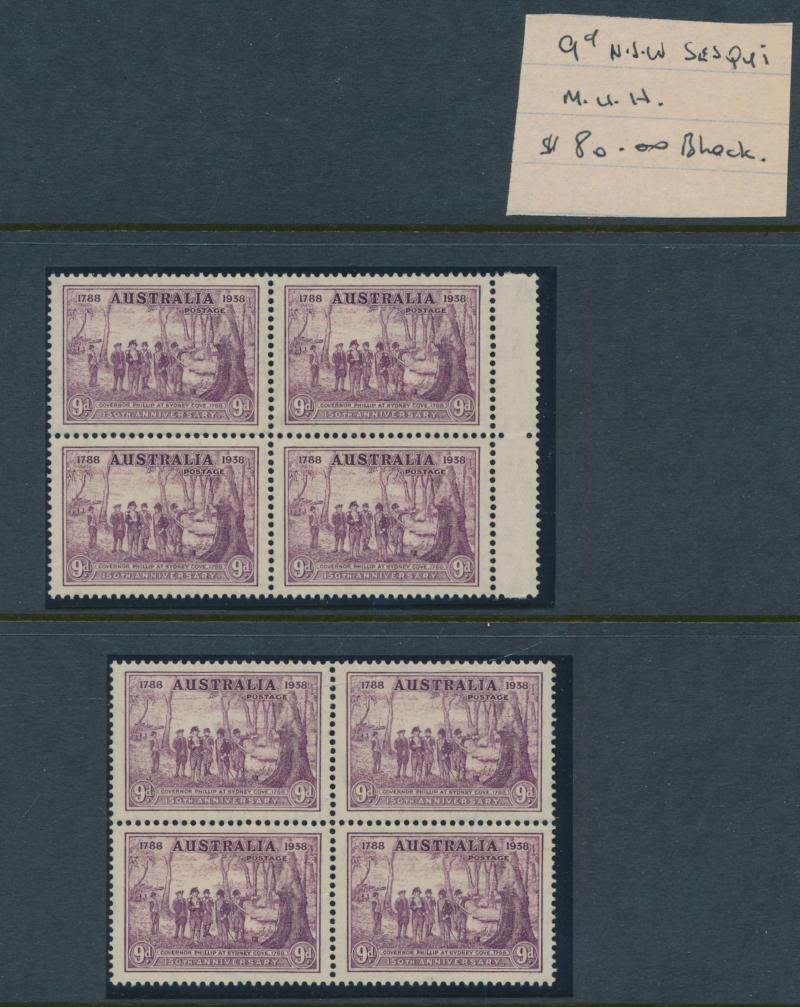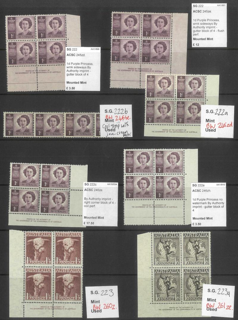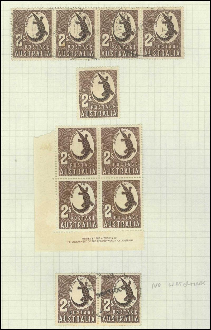15x14 Left pane No Imprint block of 4 203zl ** as well as Recut Imprint type II block of 4 203zh **; 6d Kookaburra No Wmk block of 15 (5x3) with Re-Entry between Top Frame and First Shading Line 204i and j *; 9d Platypus perf 15x14 upper and lower
