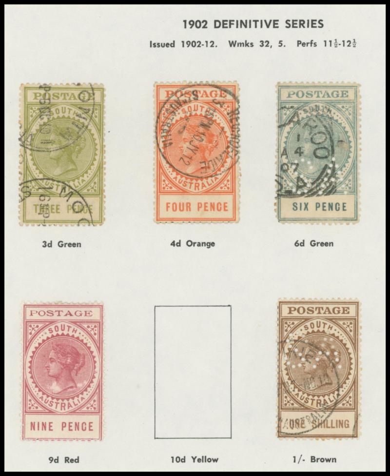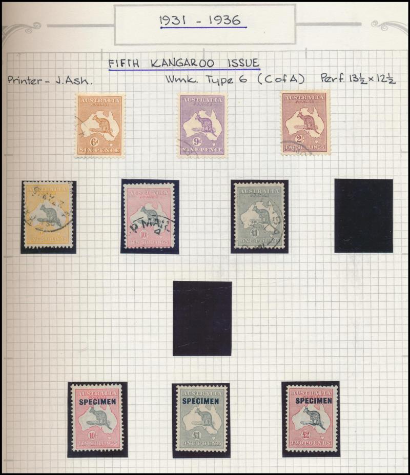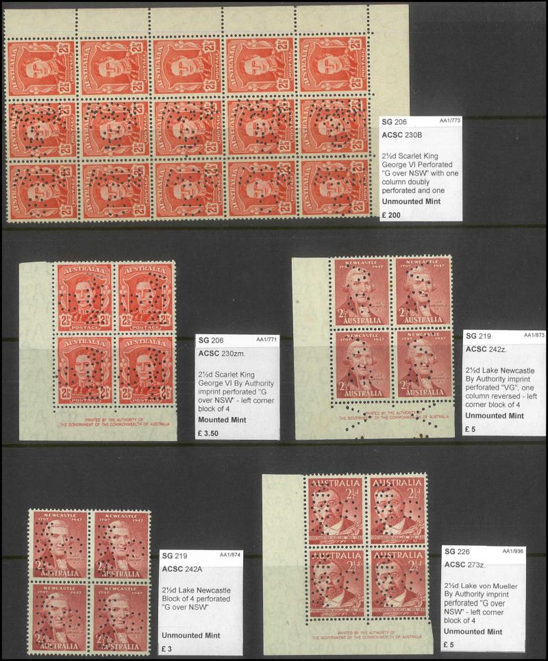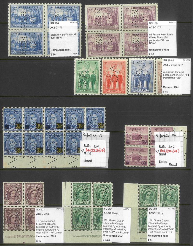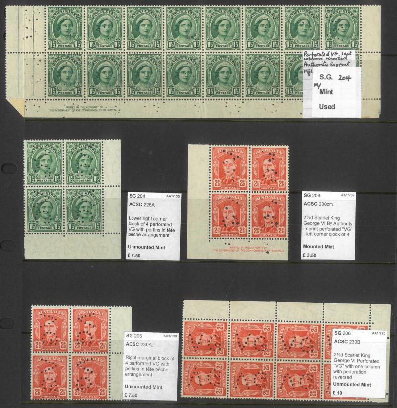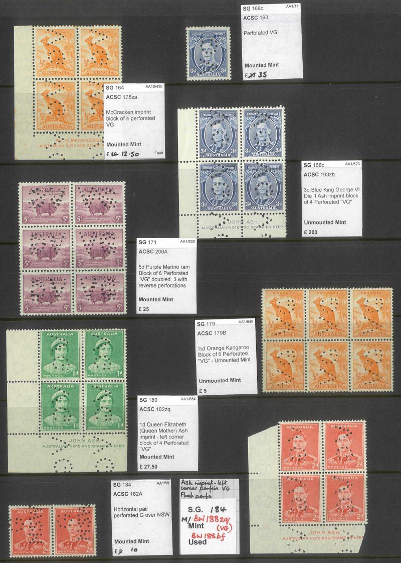 from 'SPECIMEN' folders, State perfins including some errors and freaks, No Wmk ½d kangaroo coils strip of 7 with Foggy Hills Retouch ACSC 180bh and ga **/*; 5d merino Perf 13½x14 perf pip block of 16 (8x2) from sheet F 200be **; 6d Kookaburra perf