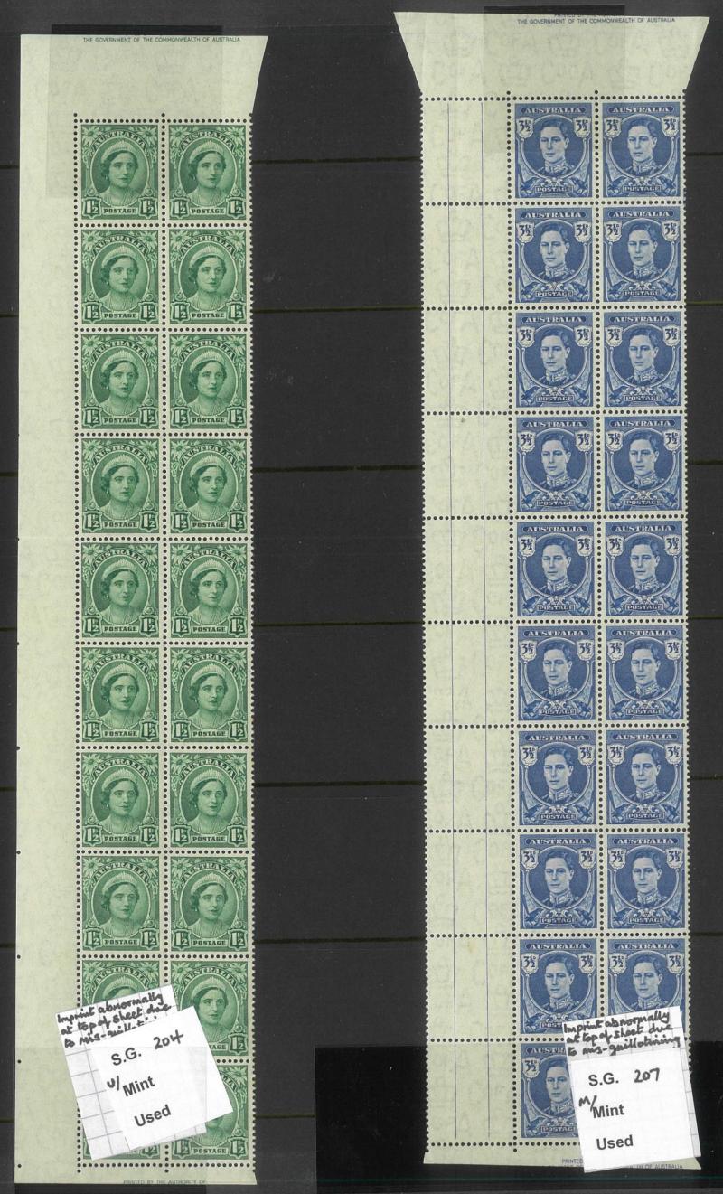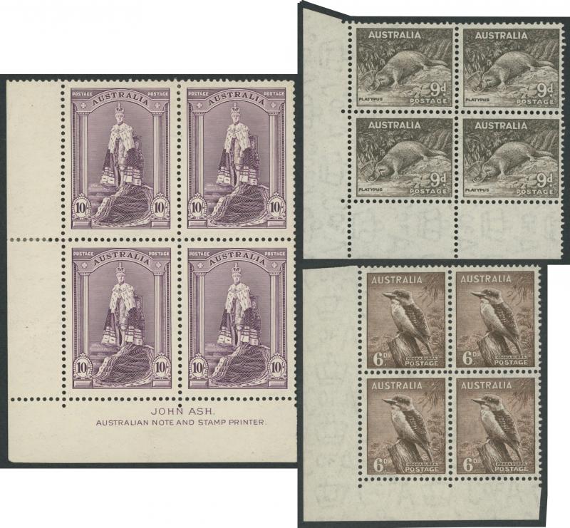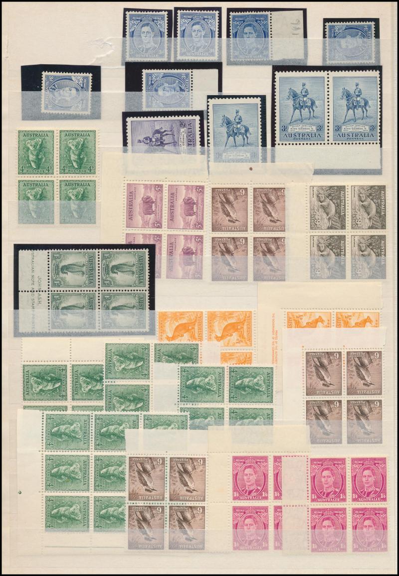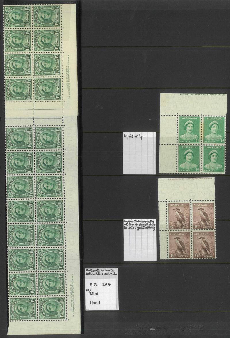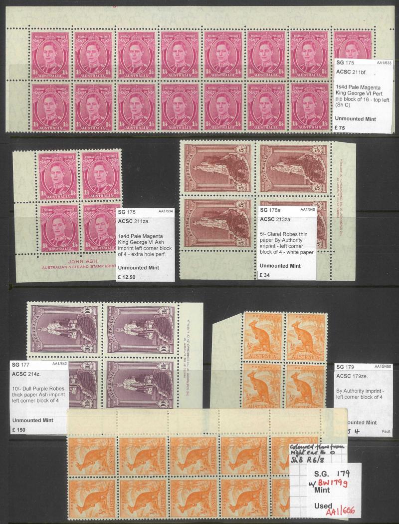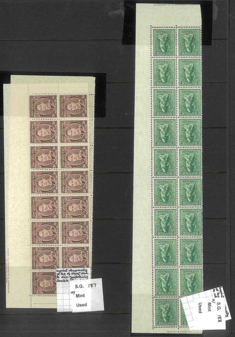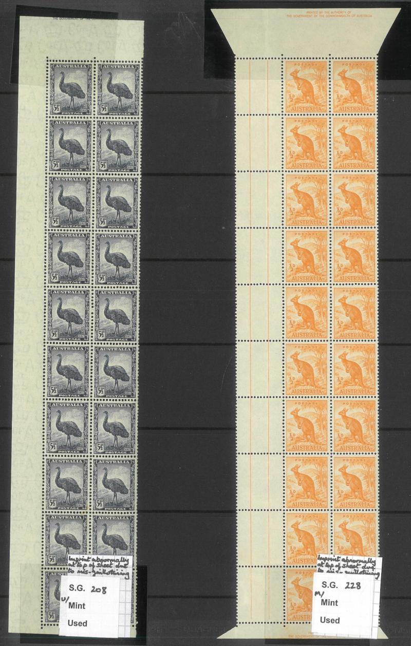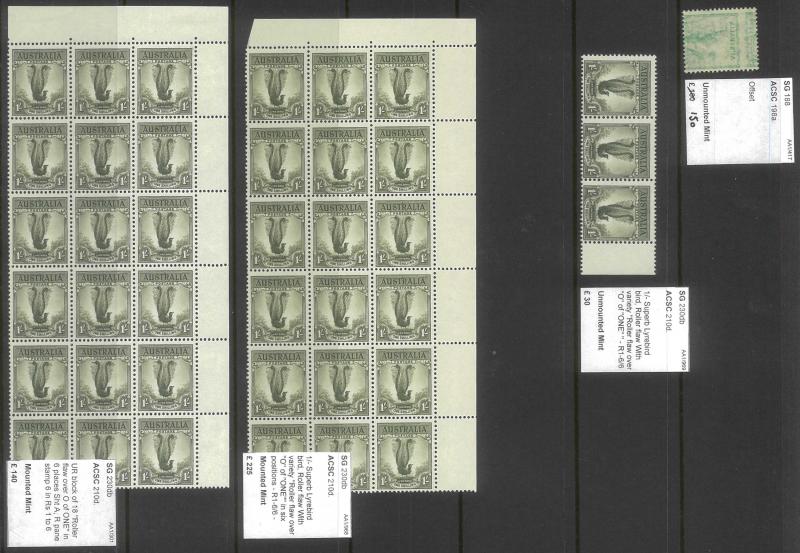 panes No Imprint blocks of 4 206zi & zg; 1/- Lyrebird No Wmk blocks of 18 (9x3) with Roller Flaws over 'O' 210d (2 blocks); KGVI 1/4d perf pip block of 16 (2x8) from sheet C 211bf; 10/- Robes thick paper John Ash Imprint and 5/- and 10/- Robes