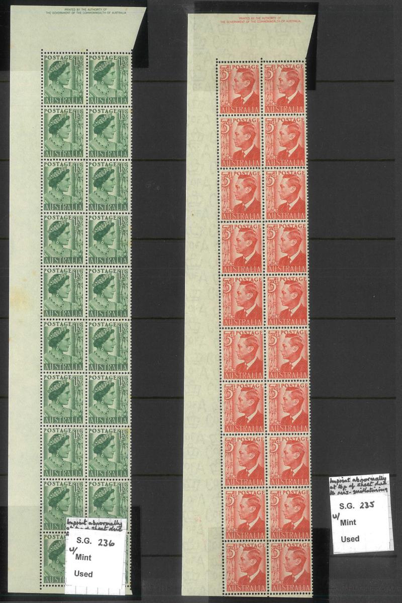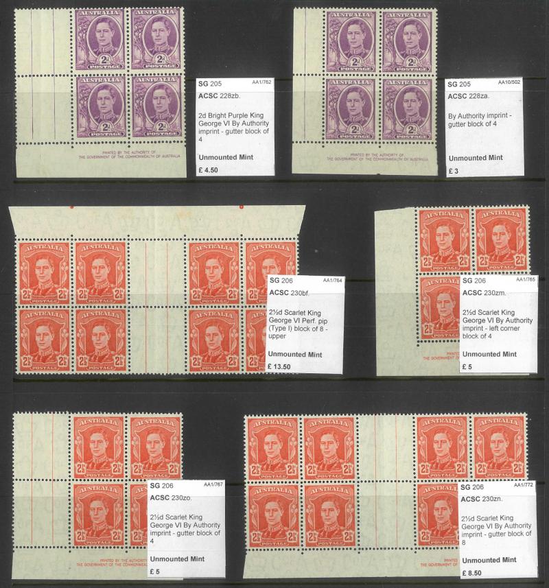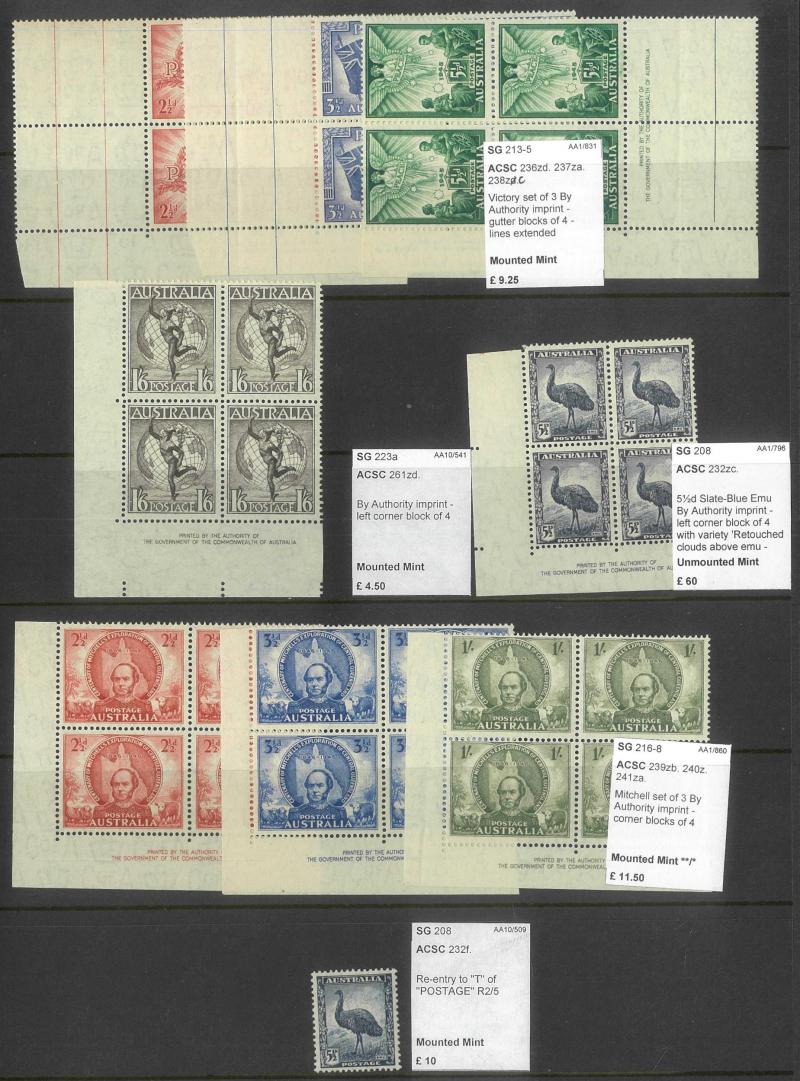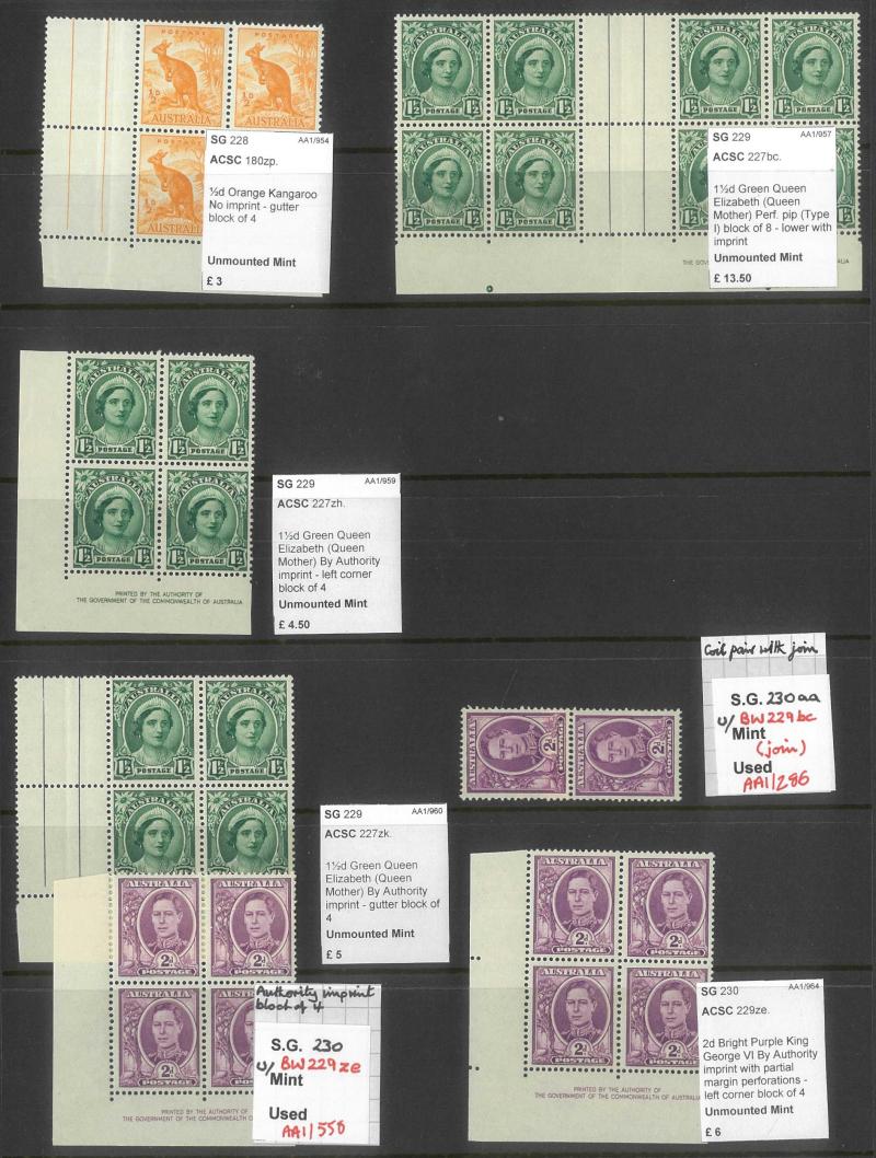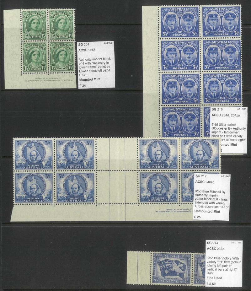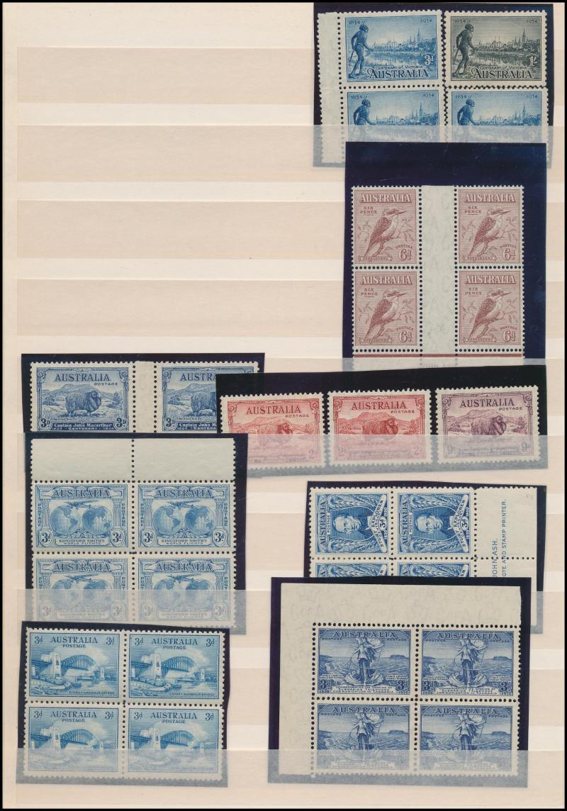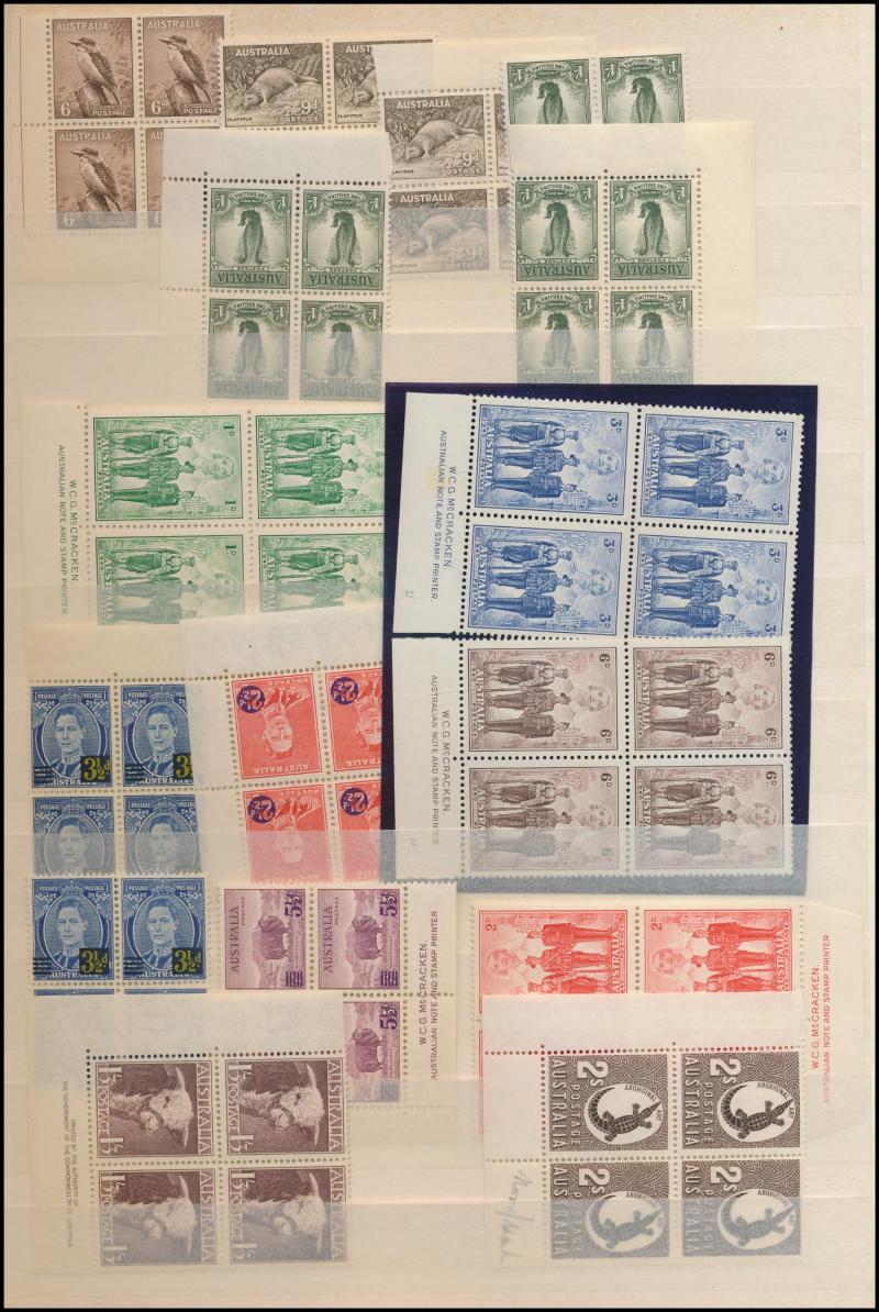 panes No Imprint blocks of 4 206zi & zg; 1/- Lyrebird No Wmk blocks of 18 (9x3) with Roller Flaws over 'O' 210d (2 blocks); KGVI 1/4d perf pip block of 16 (2x8) from sheet C 211bf; 10/- Robes thick paper John Ash Imprint and 5/- and 10/- Robes