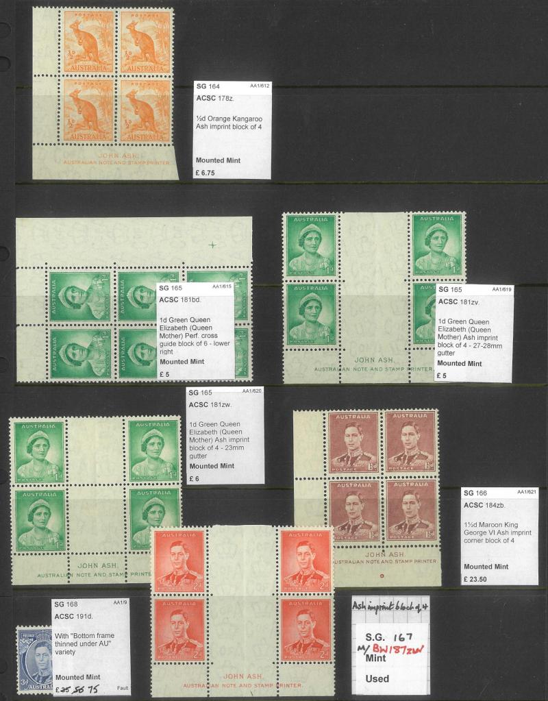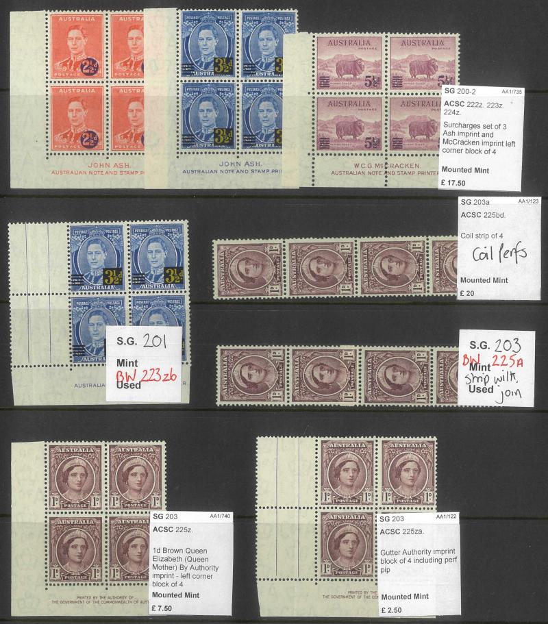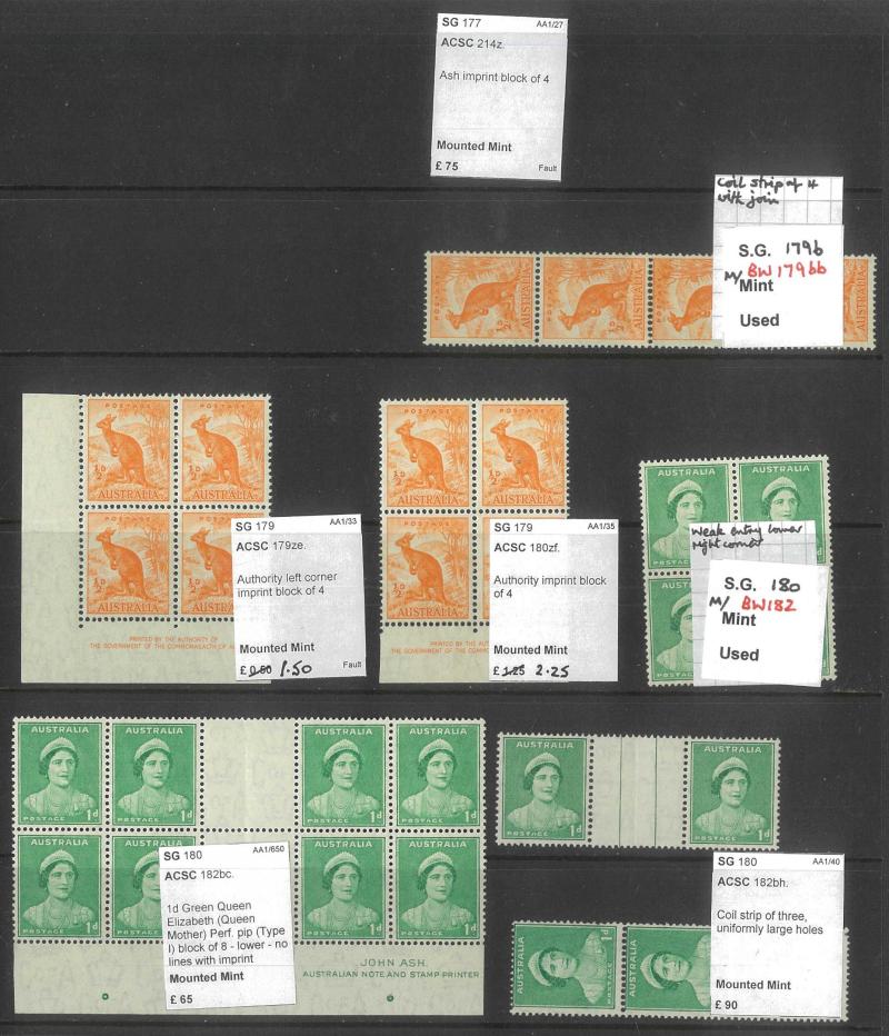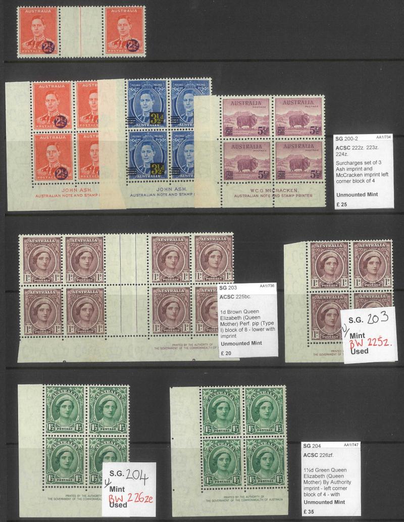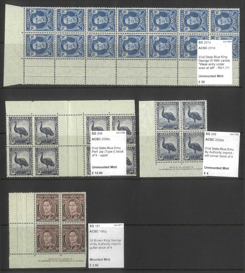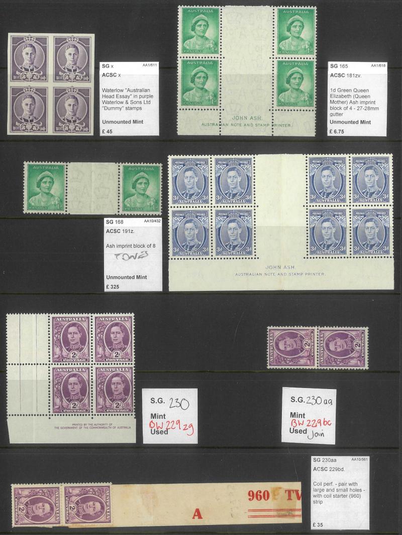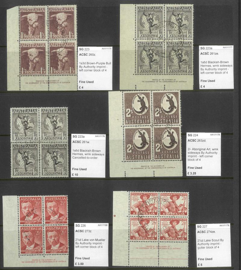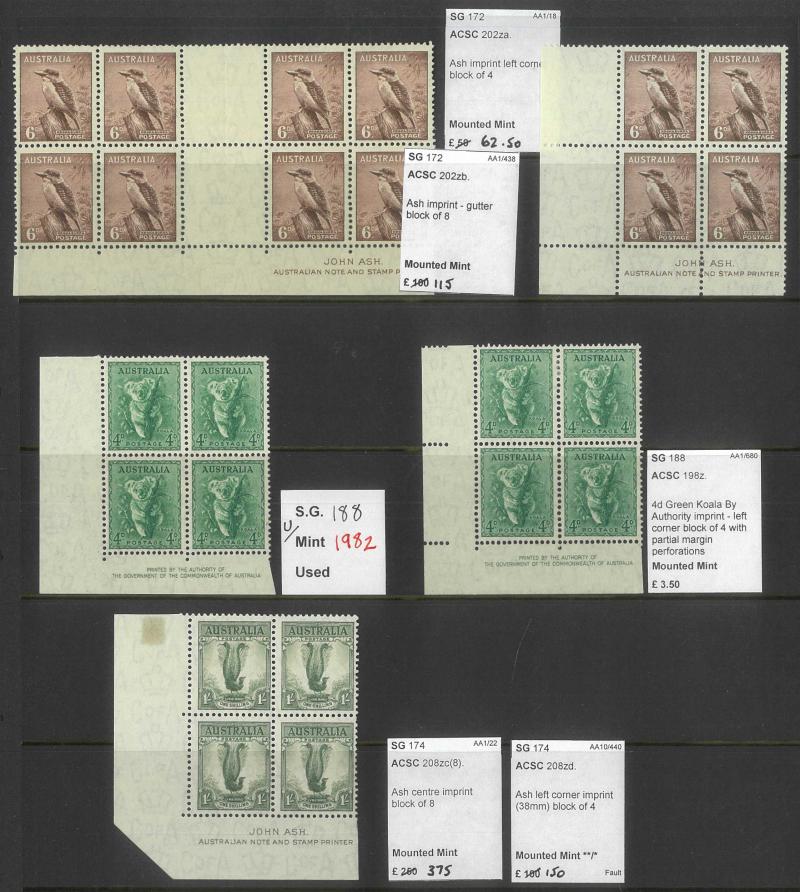 panes No Imprint blocks of 4 206zi & zg; 1/- Lyrebird No Wmk blocks of 18 (9x3) with Roller Flaws over 'O' 210d (2 blocks); KGVI 1/4d perf pip block of 16 (2x8) from sheet C 211bf; 10/- Robes thick paper John Ash Imprint and 5/- and 10/- Robes