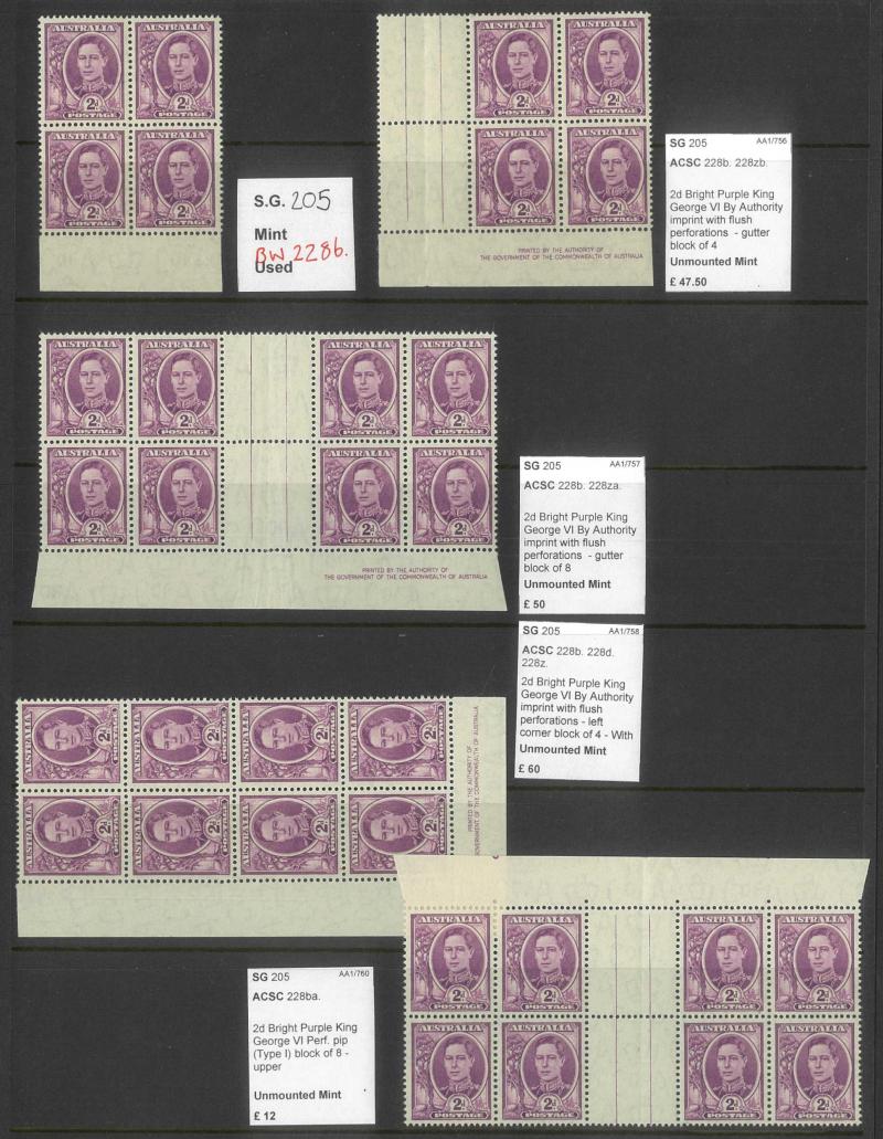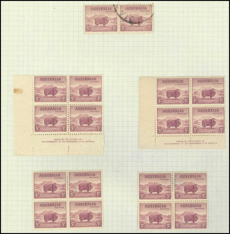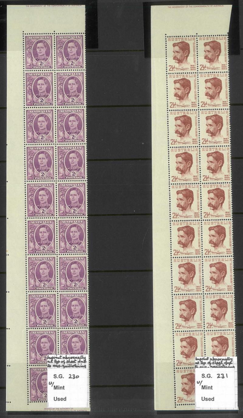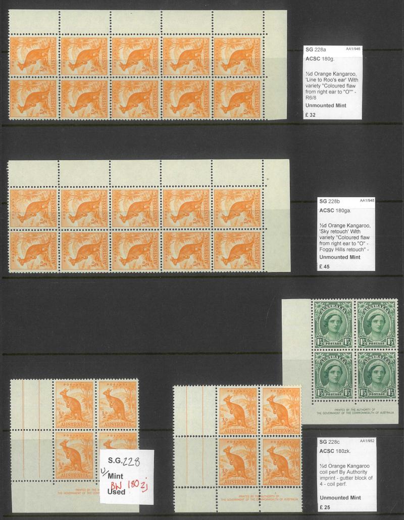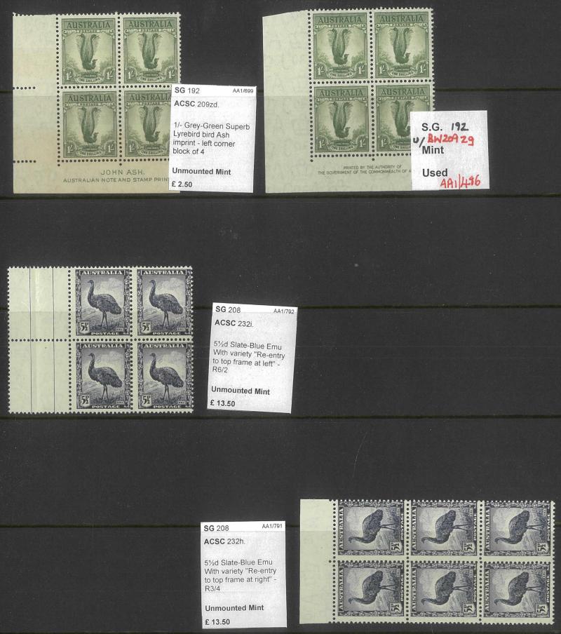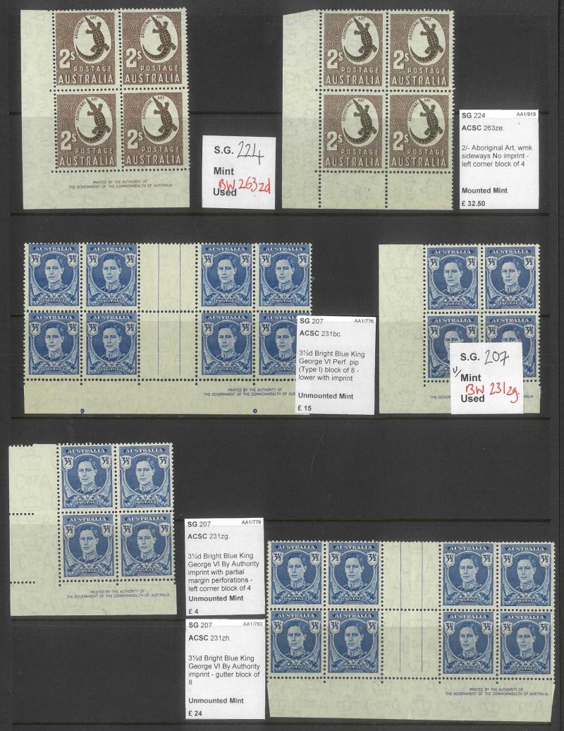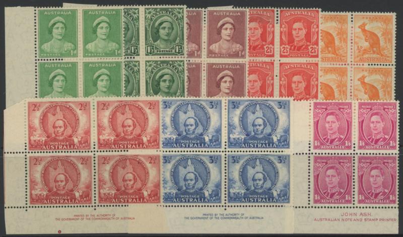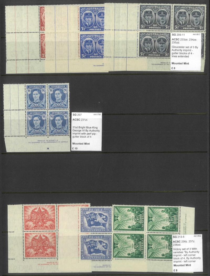 panes No Imprint blocks of 4 206zi & zg; 1/- Lyrebird No Wmk blocks of 18 (9x3) with Roller Flaws over 'O' 210d (2 blocks); KGVI 1/4d perf pip block of 16 (2x8) from sheet C 211bf; 10/- Robes thick paper John Ash Imprint and 5/- and 10/- Robes