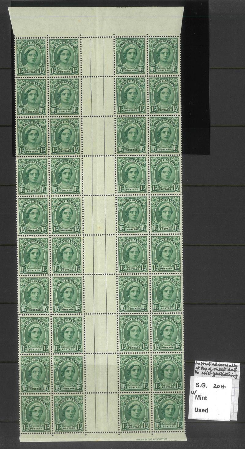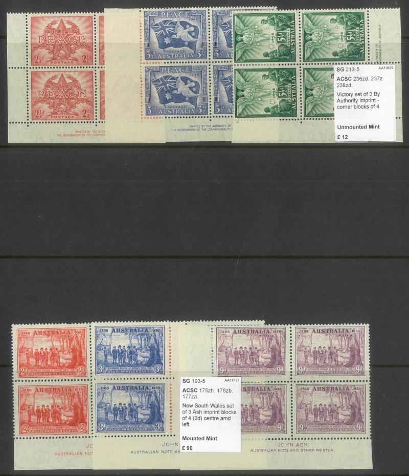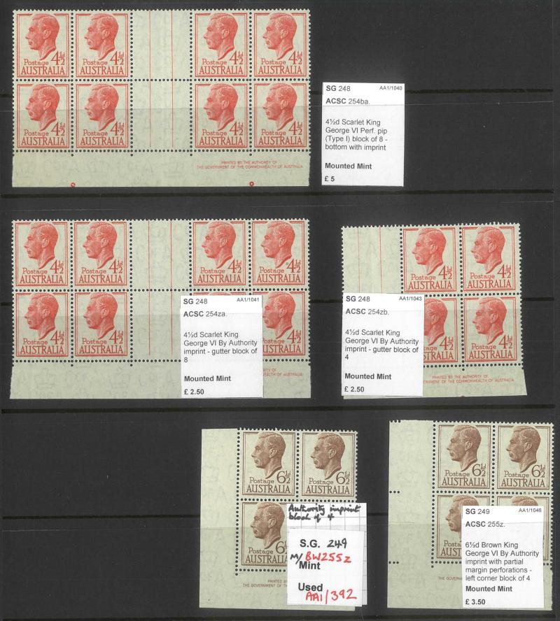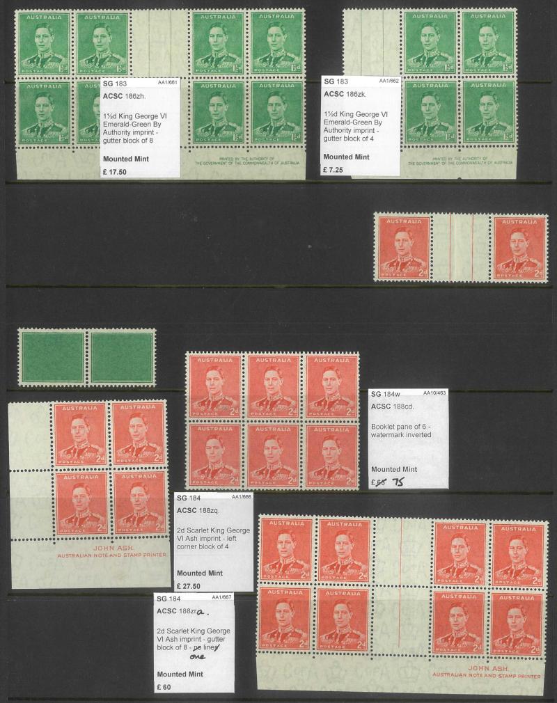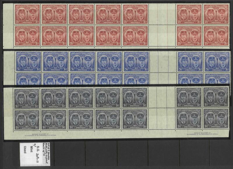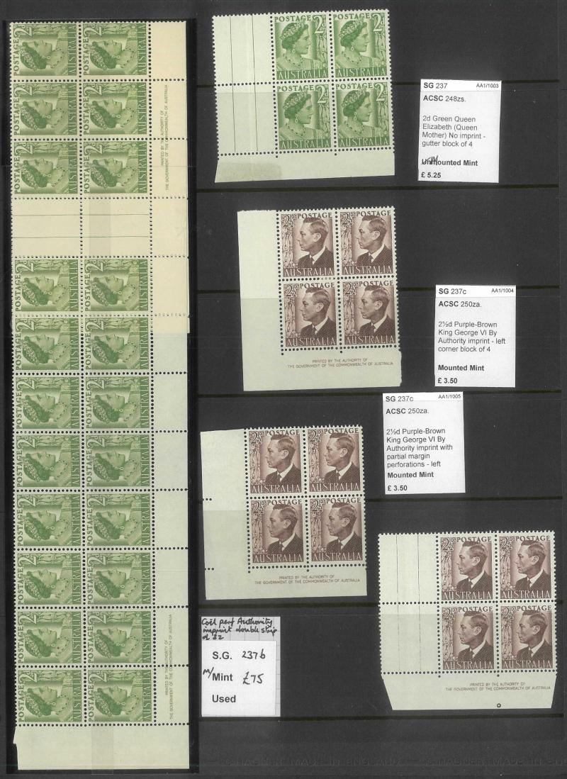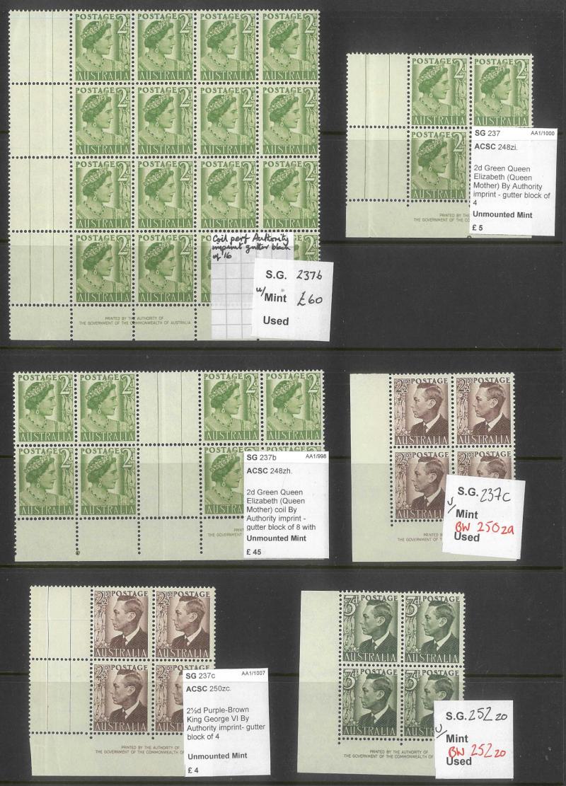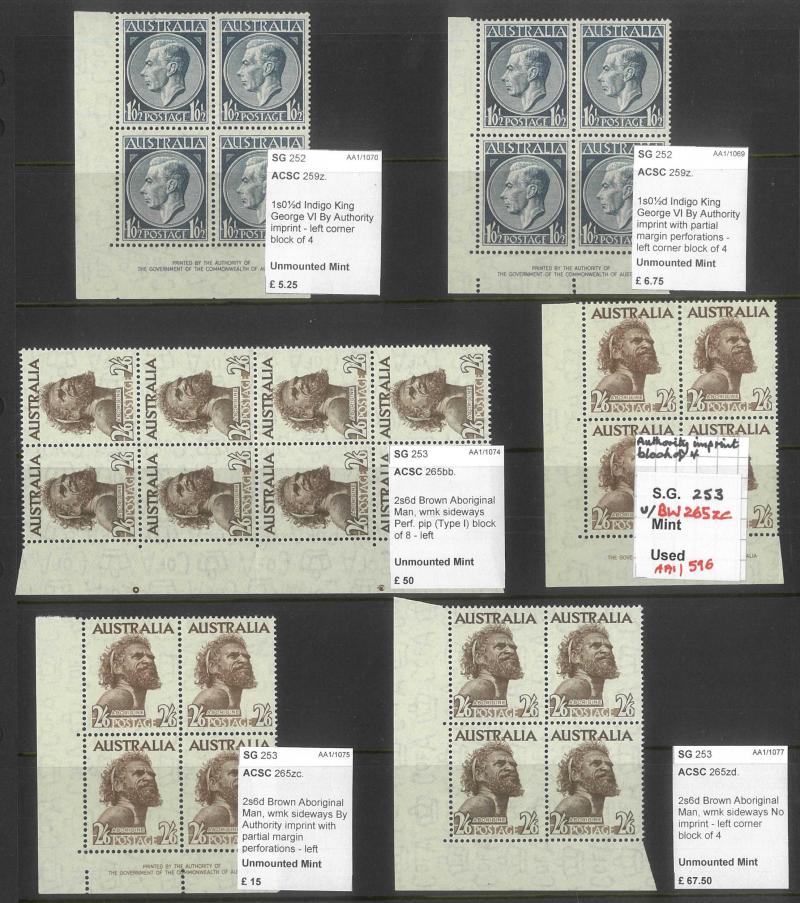 panes No Imprint blocks of 4 206zi & zg; 1/- Lyrebird No Wmk blocks of 18 (9x3) with Roller Flaws over 'O' 210d (2 blocks); KGVI 1/4d perf pip block of 16 (2x8) from sheet C 211bf; 10/- Robes thick paper John Ash Imprint and 5/- and 10/- Robes