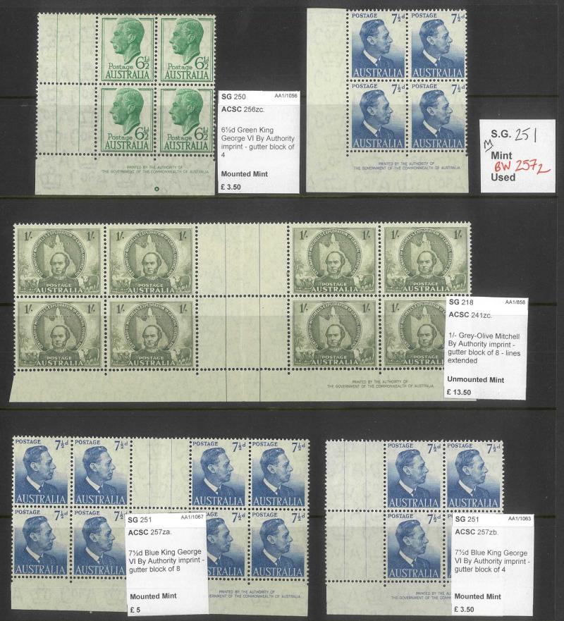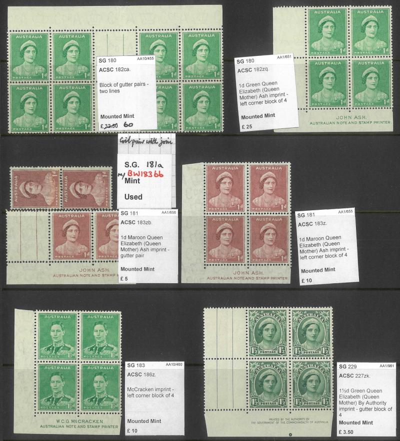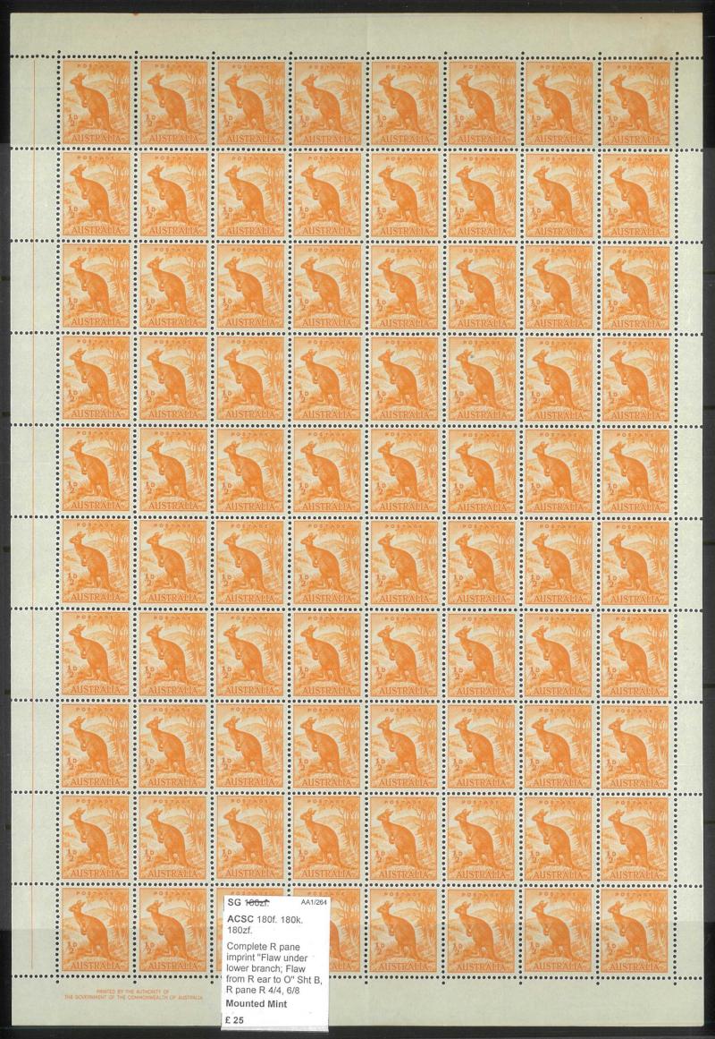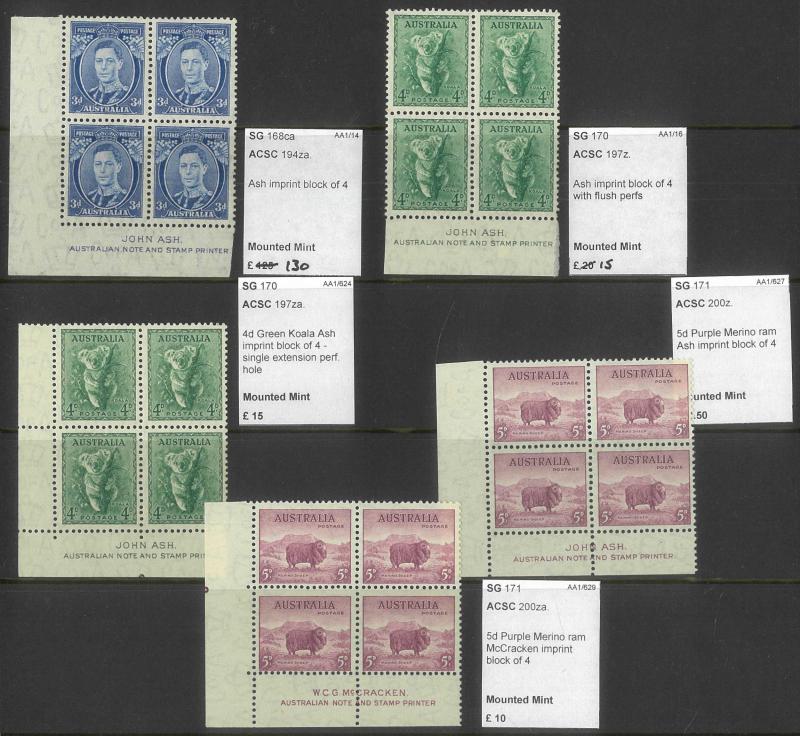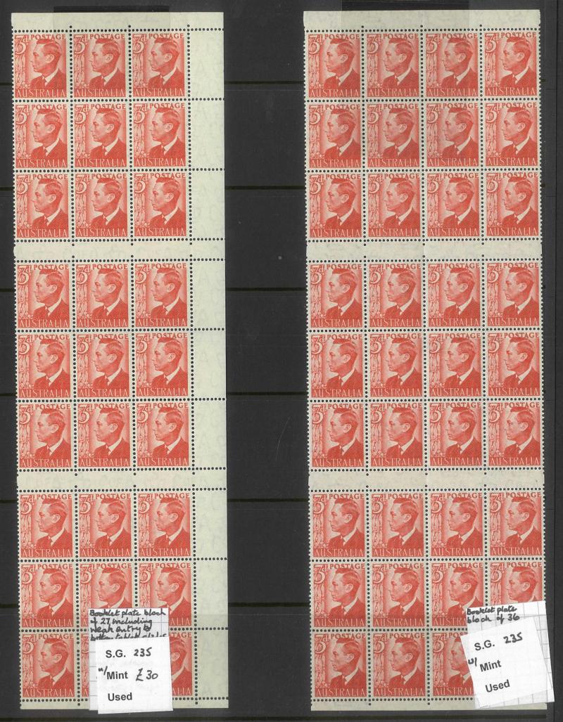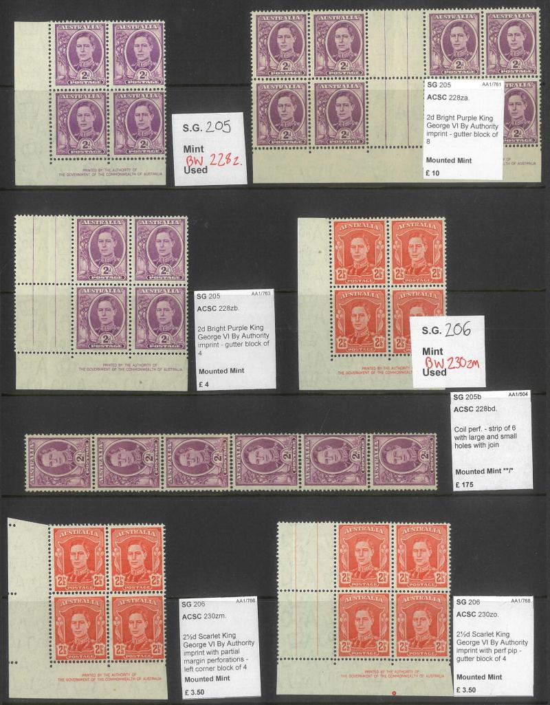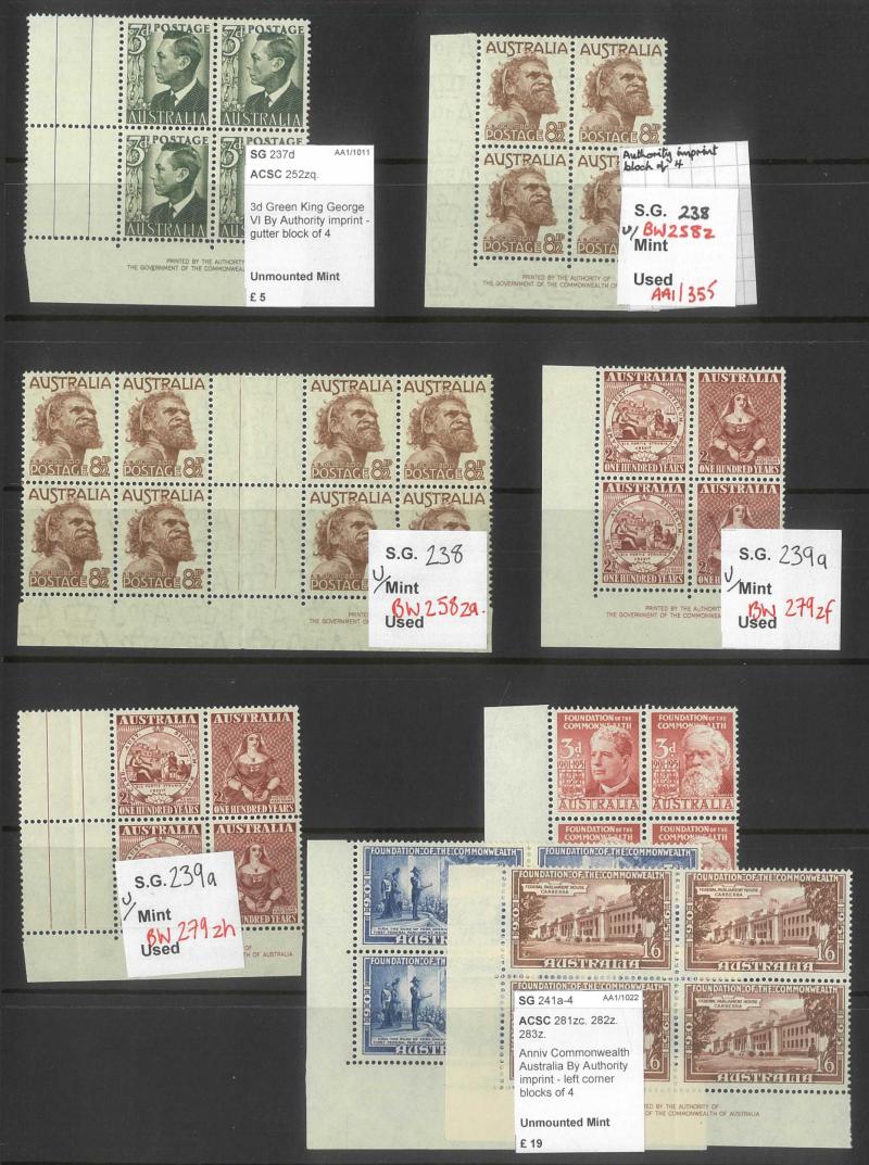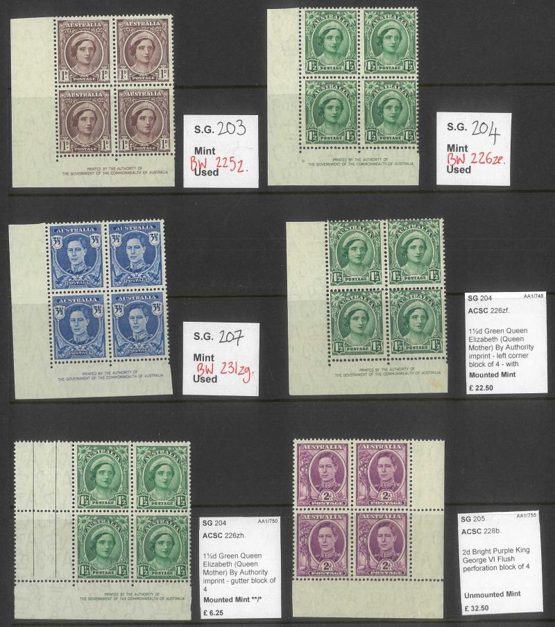 panes No Imprint blocks of 4 206zi & zg; 1/- Lyrebird No Wmk blocks of 18 (9x3) with Roller Flaws over 'O' 210d (2 blocks); KGVI 1/4d perf pip block of 16 (2x8) from sheet C 211bf; 10/- Robes thick paper John Ash Imprint and 5/- and 10/- Robes