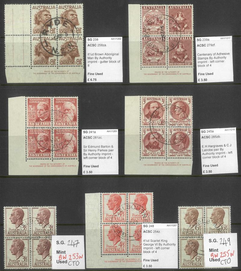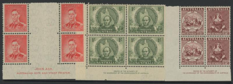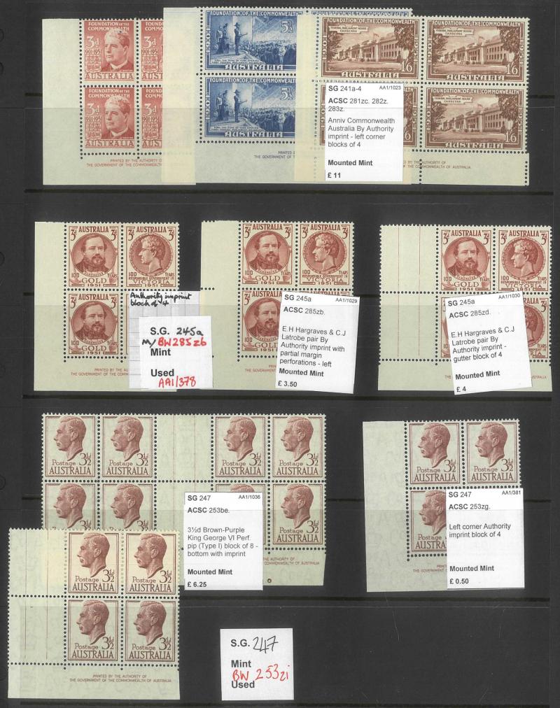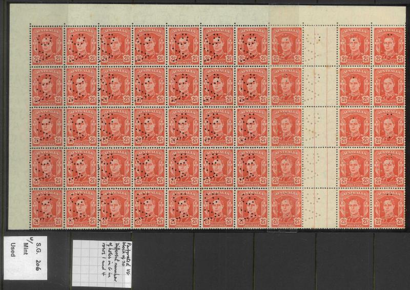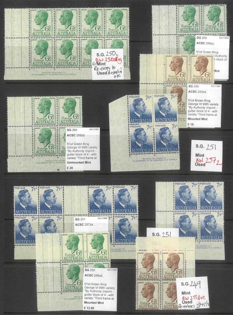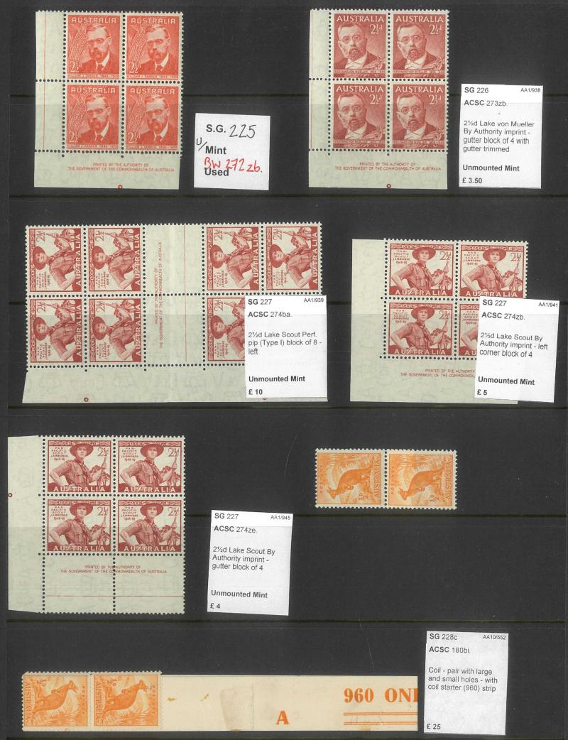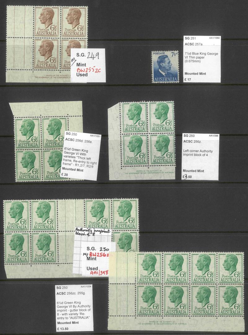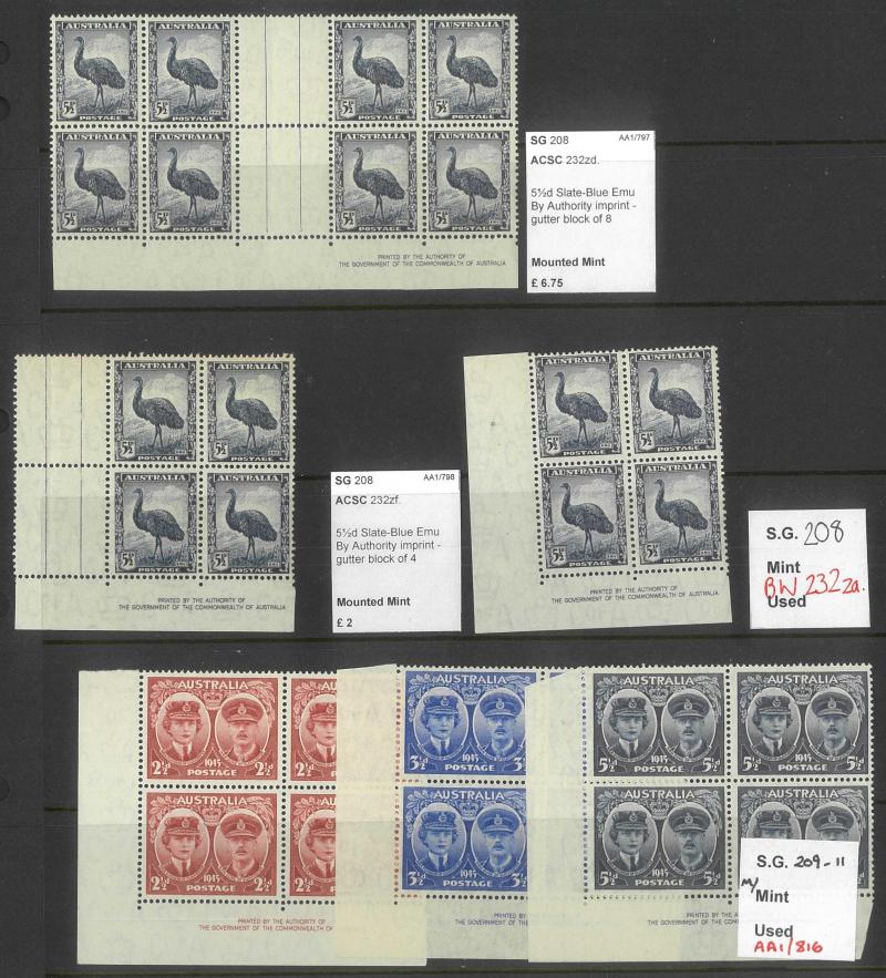 panes No Imprint blocks of 4 206zi & zg; 1/- Lyrebird No Wmk blocks of 18 (9x3) with Roller Flaws over 'O' 210d (2 blocks); KGVI 1/4d perf pip block of 16 (2x8) from sheet C 211bf; 10/- Robes thick paper John Ash Imprint and 5/- and 10/- Robes
