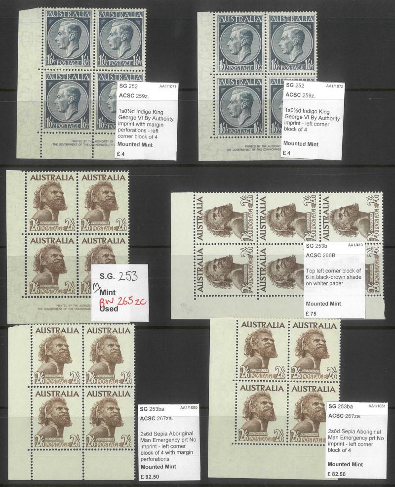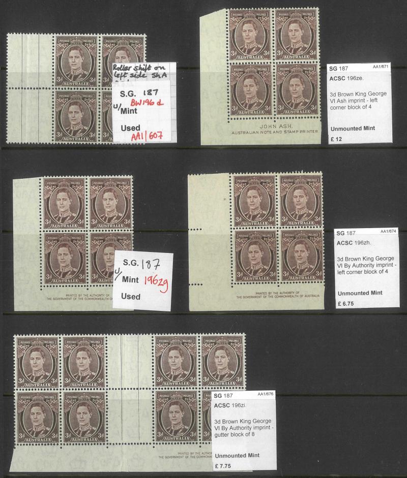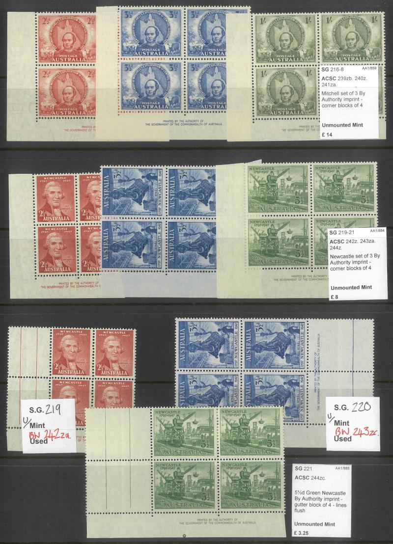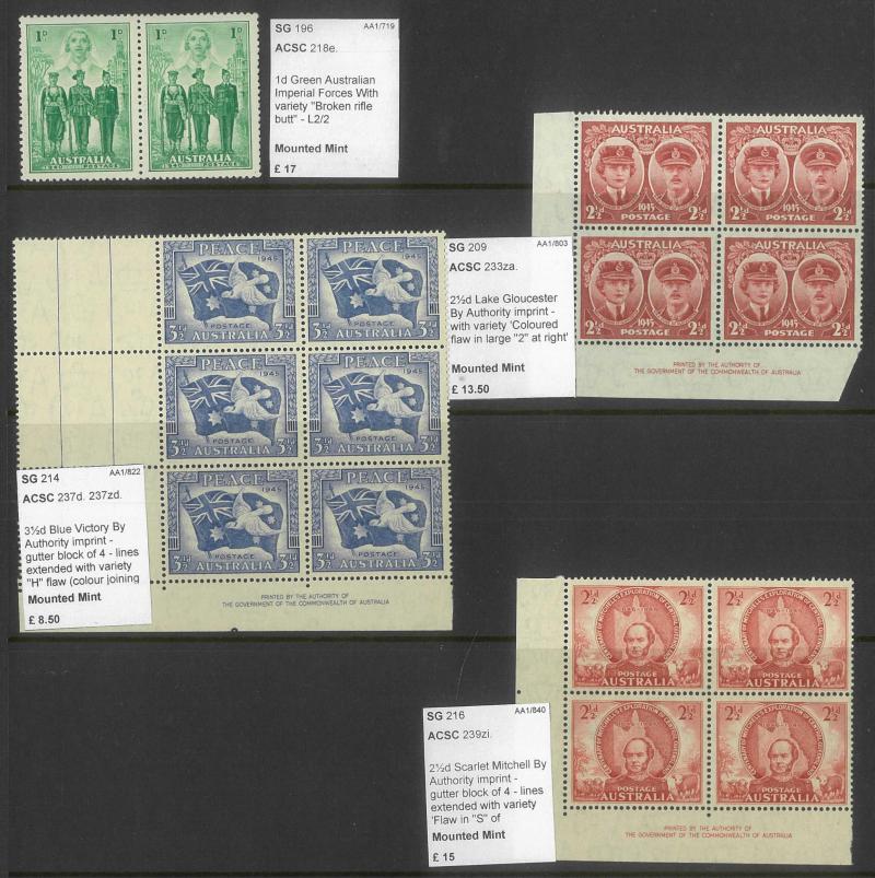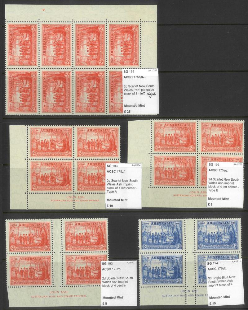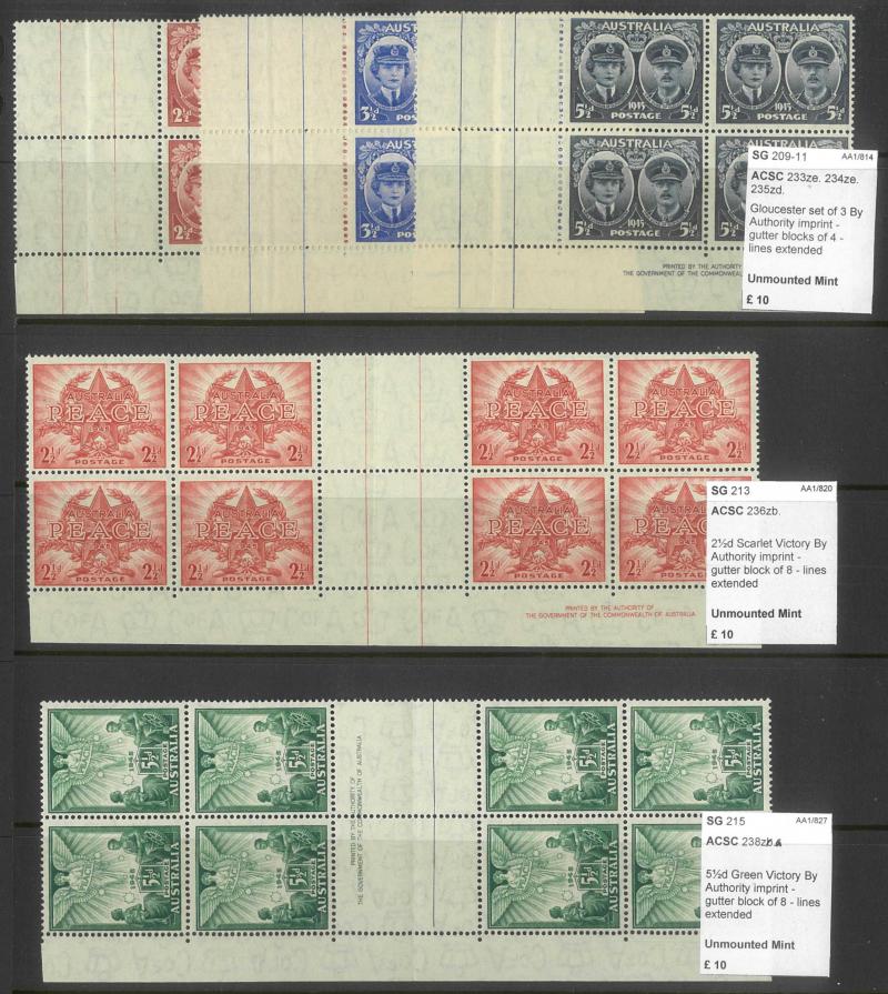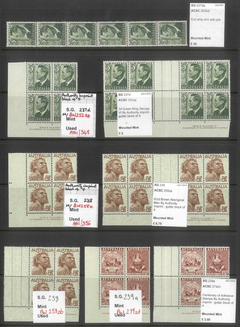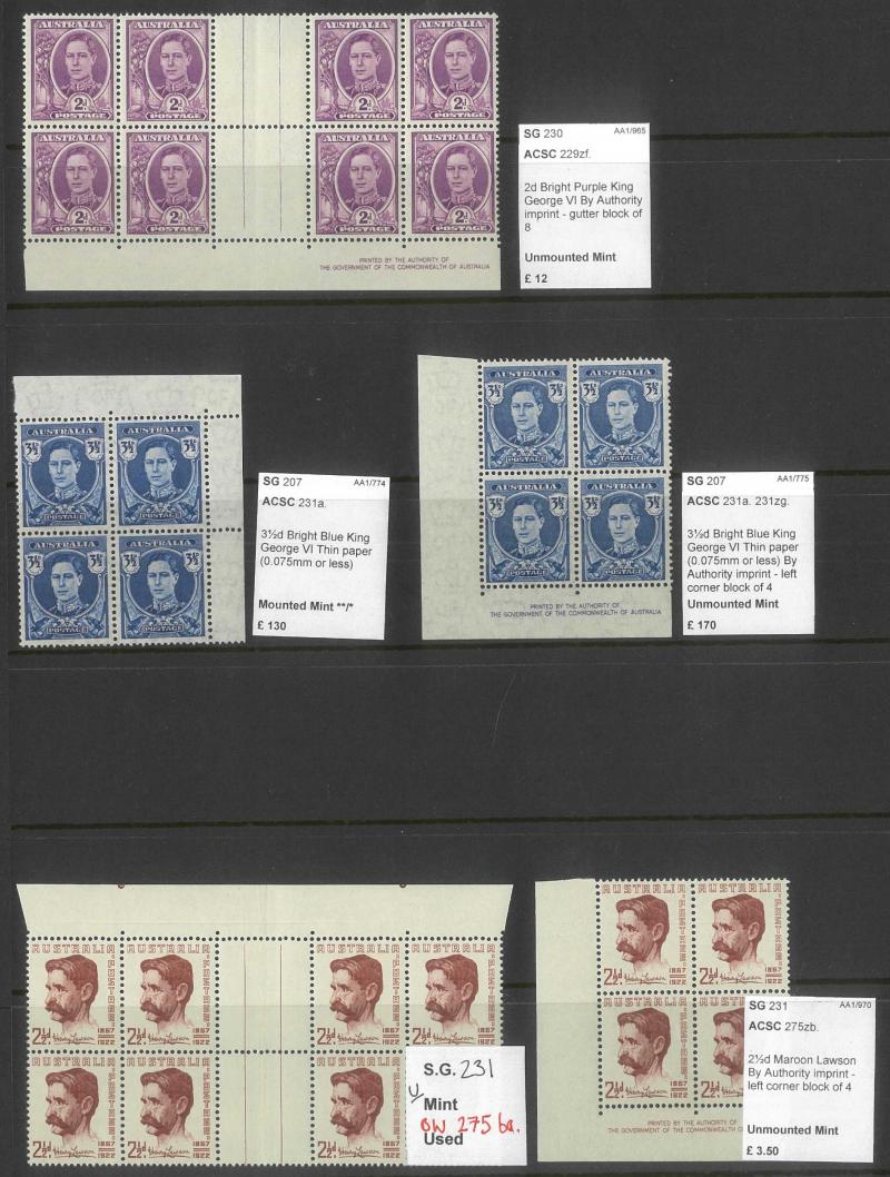panes No Imprint blocks of 4 206zi & zg; 1/- Lyrebird No Wmk blocks of 18 (9x3) with Roller Flaws over 'O' 210d (2 blocks); KGVI 1/4d perf pip block of 16 (2x8) from sheet C 211bf; 10/- Robes thick paper John Ash Imprint and 5/- and 10/- Robes