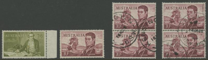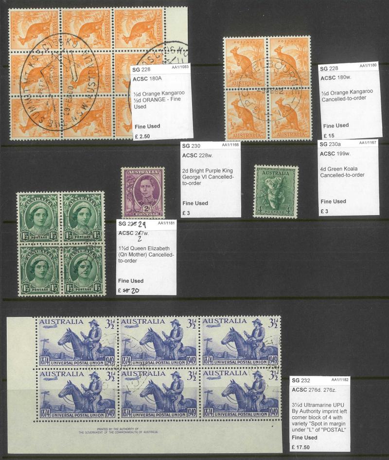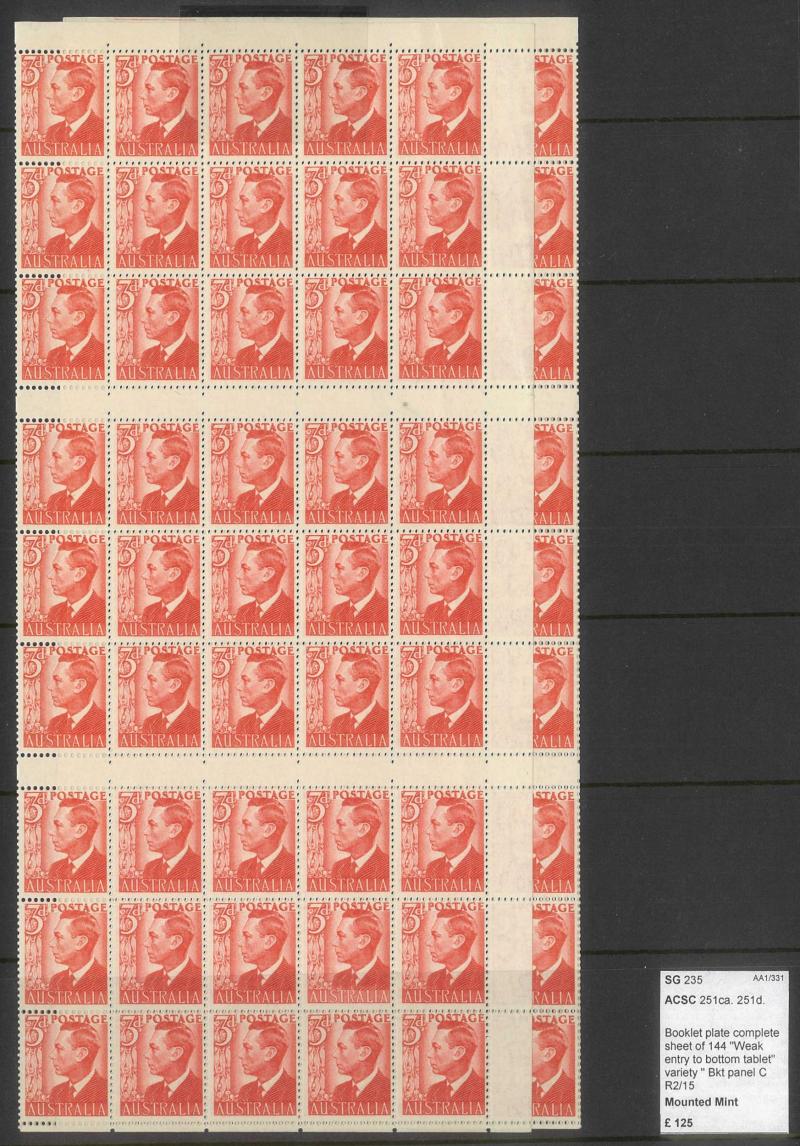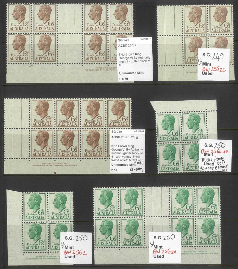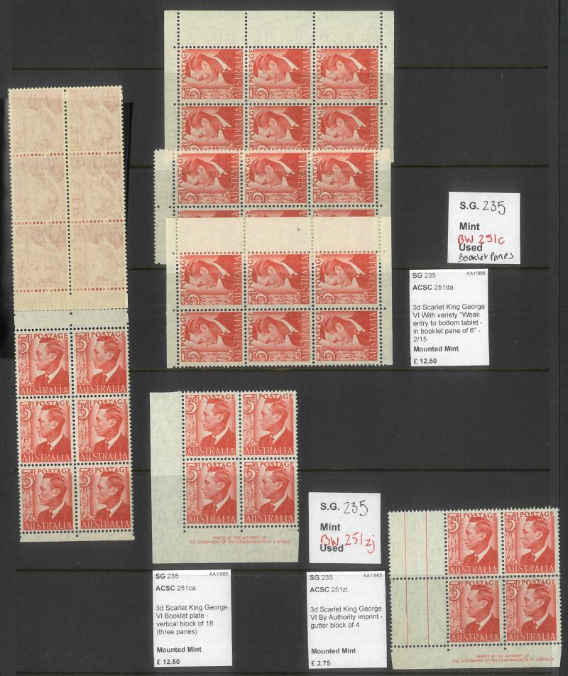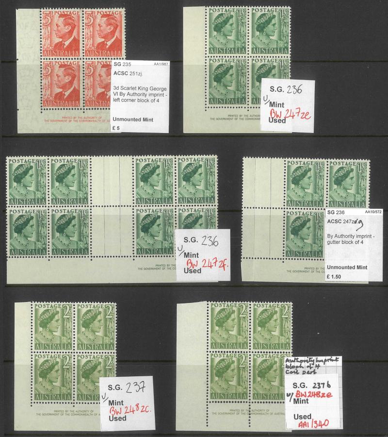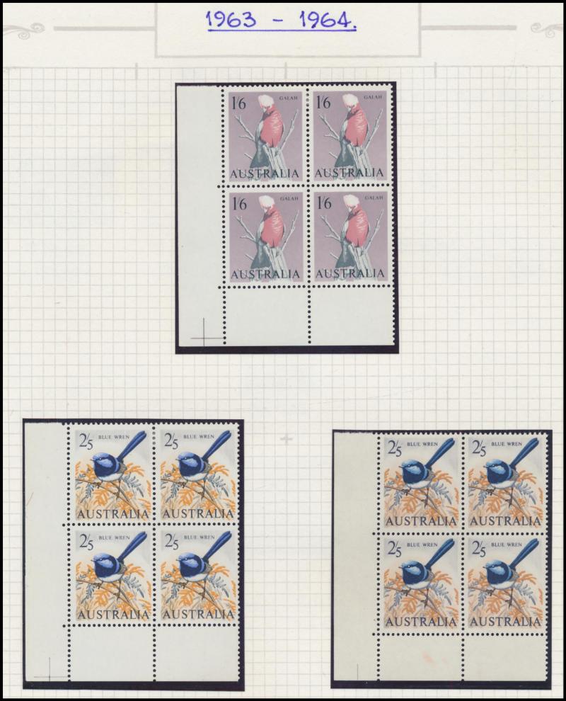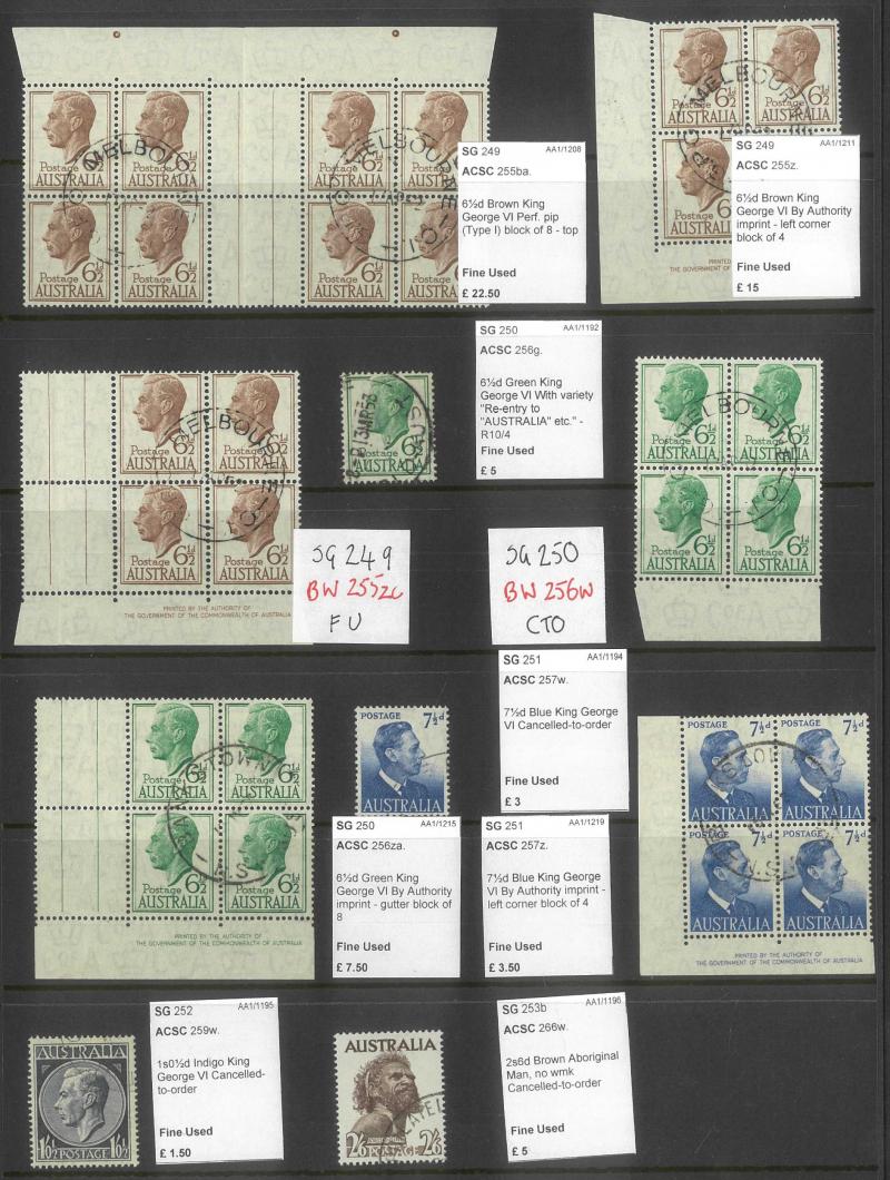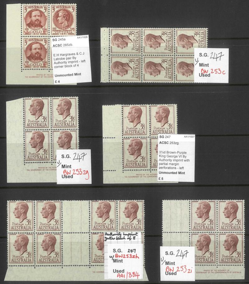 panes No Imprint blocks of 4 206zi & zg; 1/- Lyrebird No Wmk blocks of 18 (9x3) with Roller Flaws over 'O' 210d (2 blocks); KGVI 1/4d perf pip block of 16 (2x8) from sheet C 211bf; 10/- Robes thick paper John Ash Imprint and 5/- and 10/- Robes