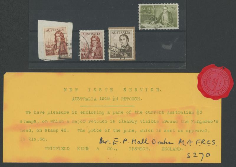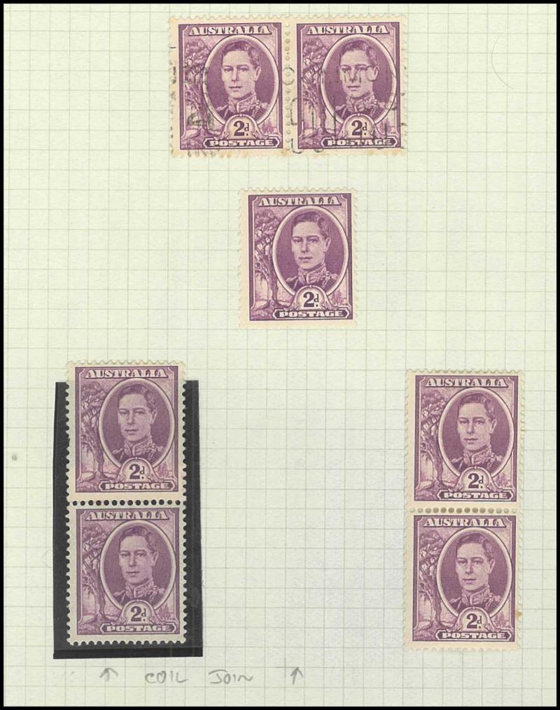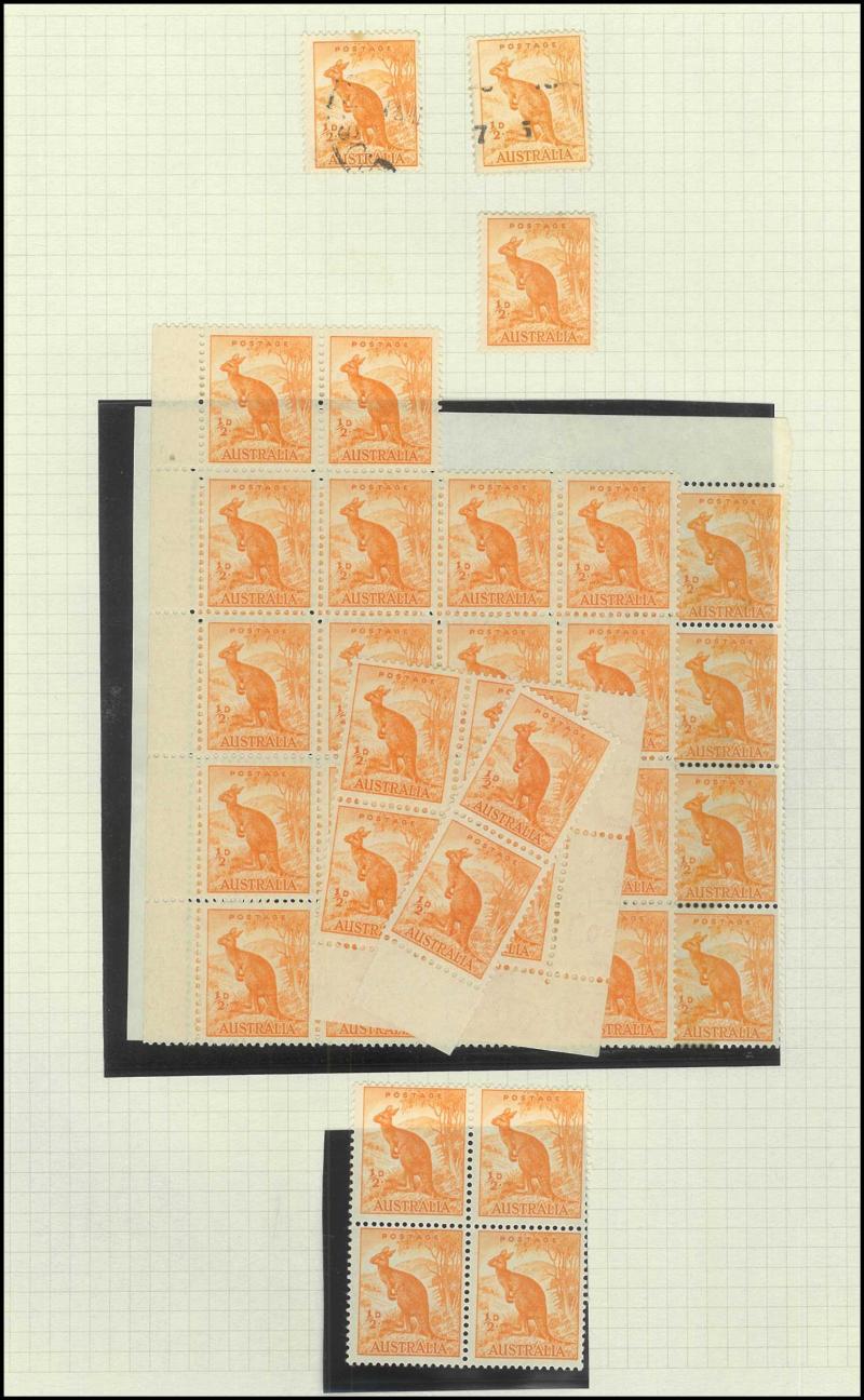 plus 1½d red Die II vertical strip of 3 the top unit with White Flaw in Crown (unused without gum), KGVI Definitives including Kangaroo ½d orange with Dash from 'O' of 'POSTAGE' to Ear single, various coil pairs & strips, a few imprint blocks */**,