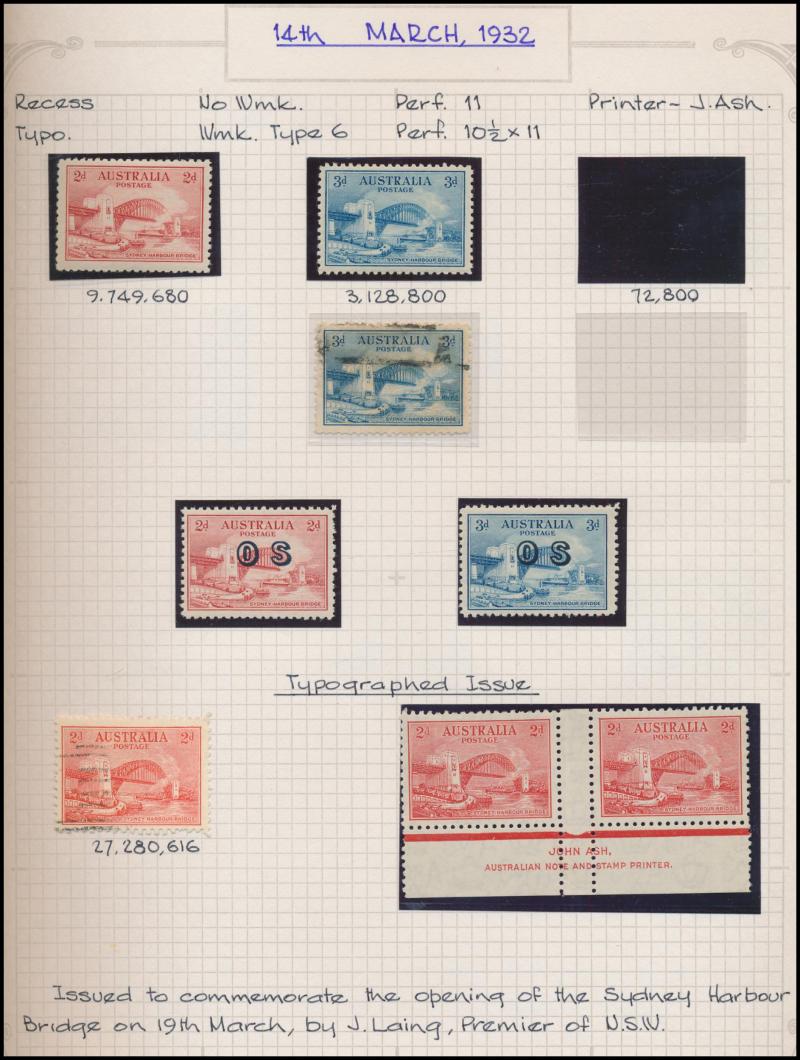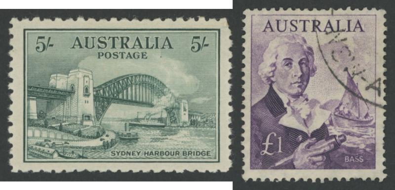 Small selection with 1932 Sydney Habour Bridge 5/- *, 1948-56 Definitives No Watermark ½d Kangaroo complete right-hand pane of 80