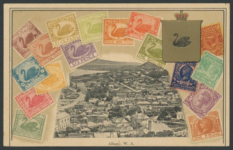PICTURE POSTCARDS: 'Albany WA' vignette view of township Zieher-type surrounded by Swans & QV stamps, published by VSM (Victoria