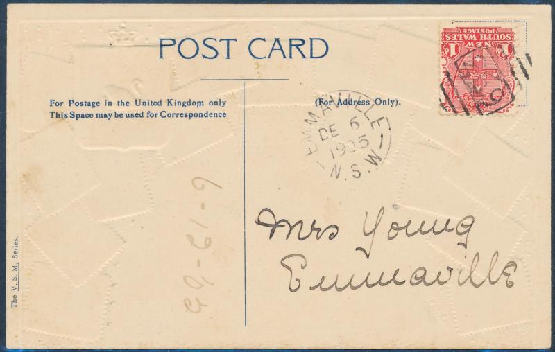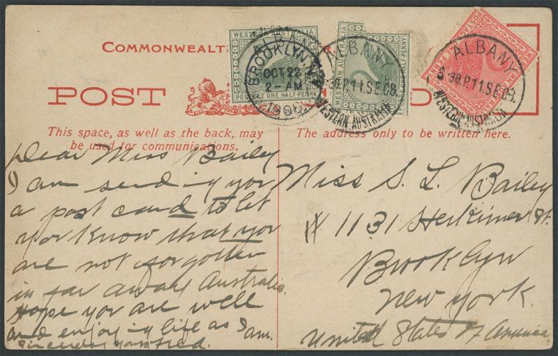 postal card of Coats of Arms & Flags with 'TO/MELBOURNE' at lower-left, to New York USA with Swans ½d green x2 (one damaged before being affixed) & 1d pink tied by Albany cds cancels, a couple of minor transmission marks. Almost certainly sent by a