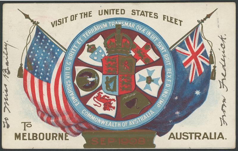 1908 (Sept 11) usage of Commonwealth of Australia 'Visit of the United States Fleet/to Melbourne Sept 1908 Australia' formular