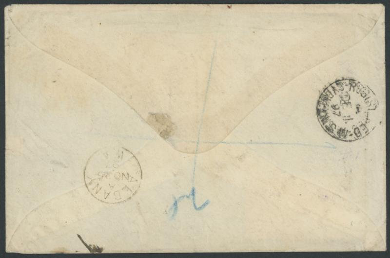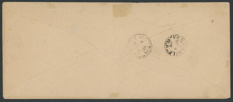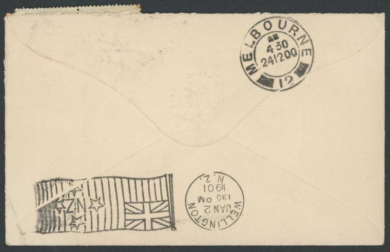 1d violet pair tied by Fremantle duplex cancels, Melbourne transit and superb Wellington 'Flag' machine cancel arrival backstamps, a couple of minor blemishes. Scarce non-philatelic usage paying the concessional South Pacific letter rate. (Image1) (Image2)