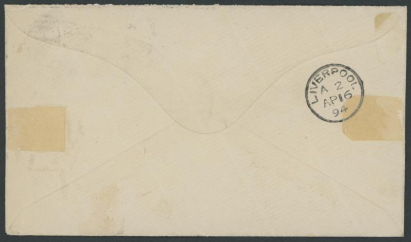 1894 (March 2) envelope to England with Postal Fiscals 'Tall Swans' 3d violet tied by Perth duplex cancel, Liverpool 'AP16/94'