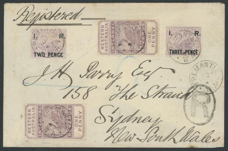 1897 (Nov 24) envelope registered to Sydney with scarce albeit philatelic franking of Postal Fiscals 'I.R.' Overprints on Swans 3d