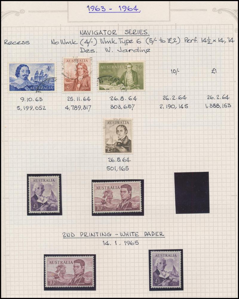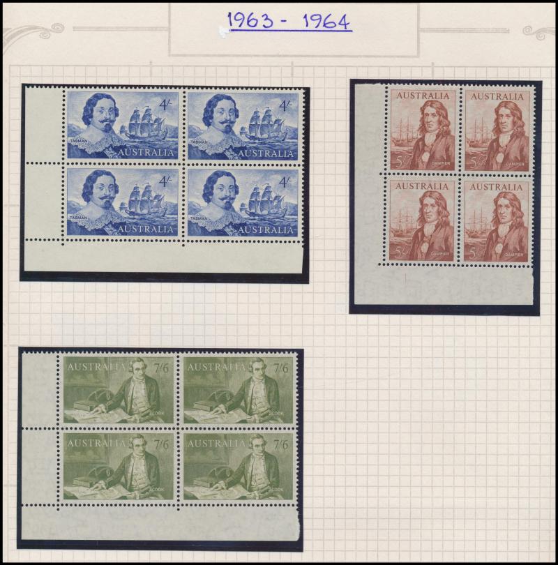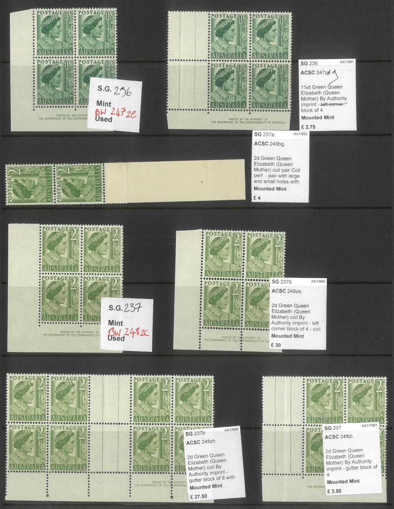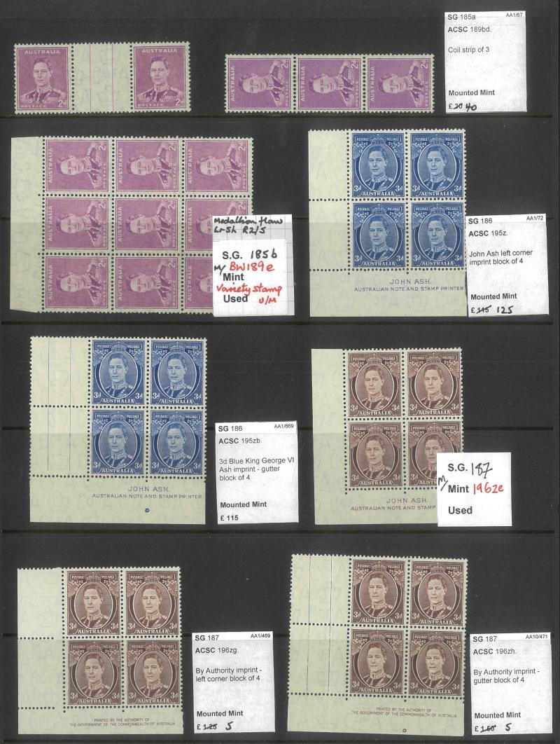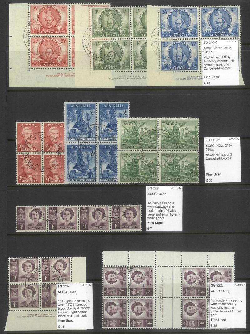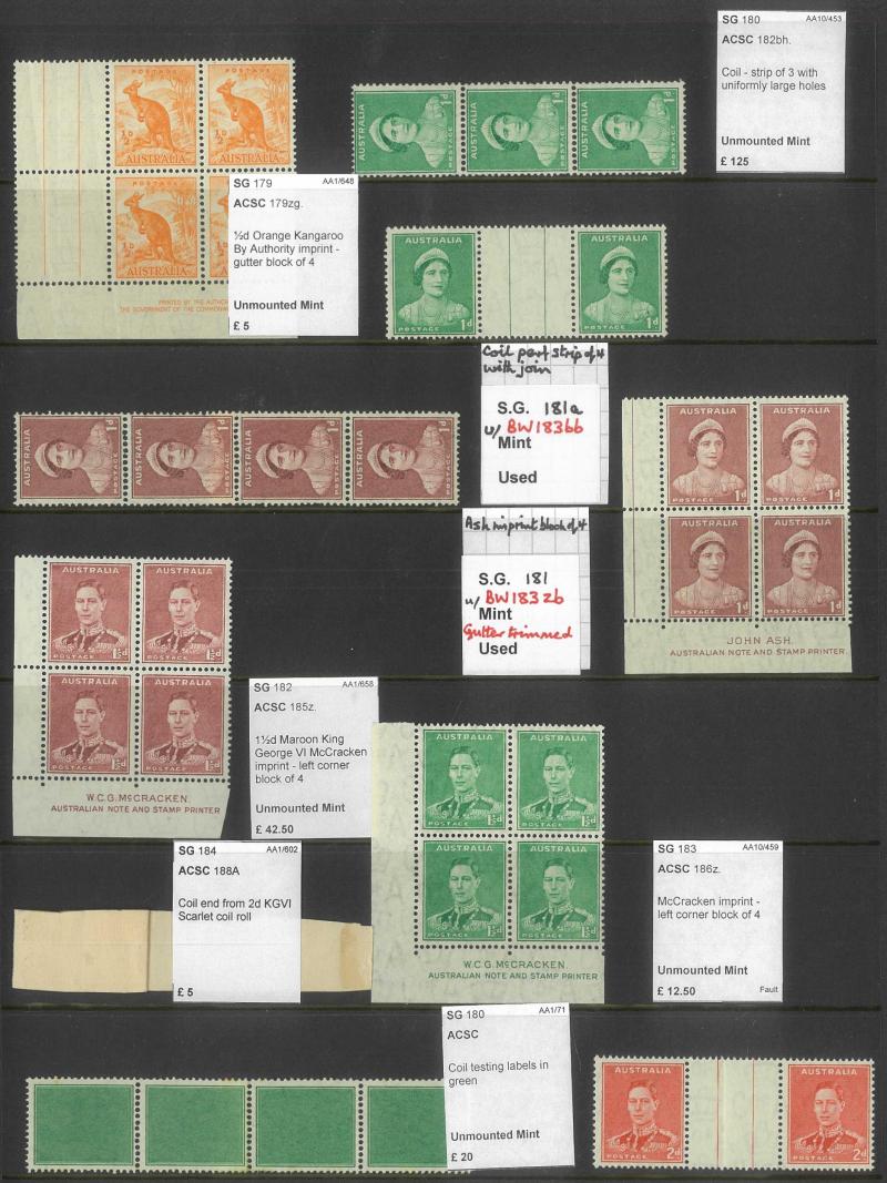 1/6 Hermes, 2/- Crocodile and 2/6 Aborigine, Navigators set of 8, BCOF set of 7, range of helocon papers, booklet panes, coils including 1959 3d QEII coil left hand block of 8 with Plate #5 and dashes below ACSC 350ze amongst other varieties noted