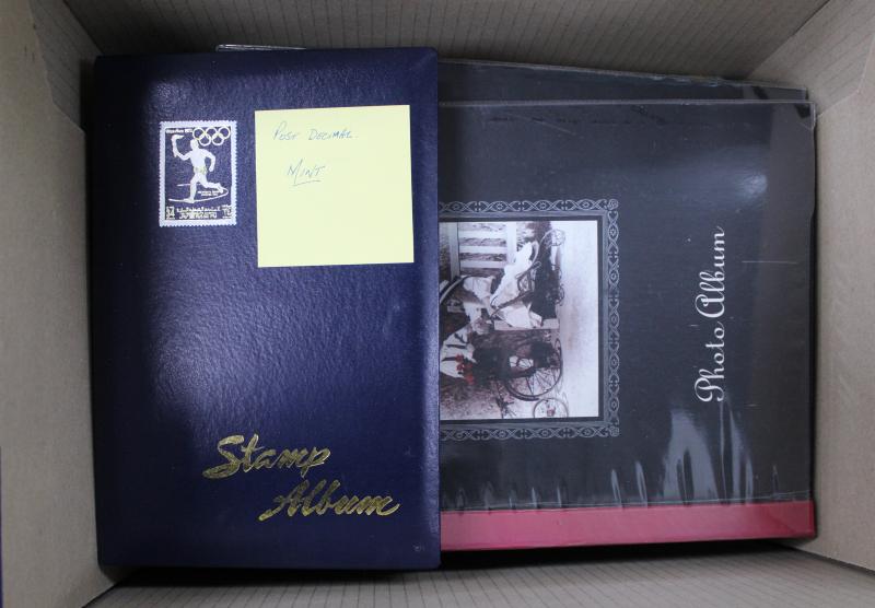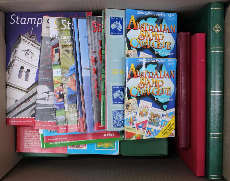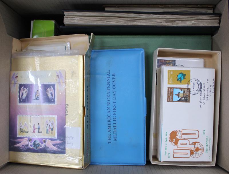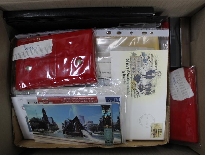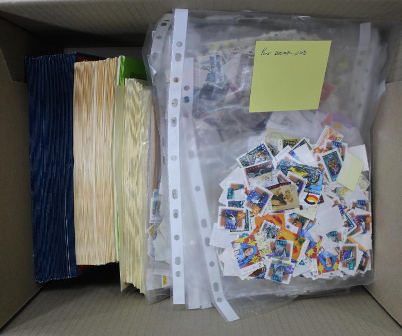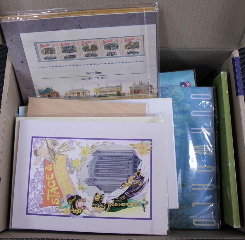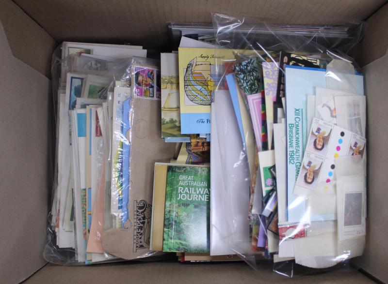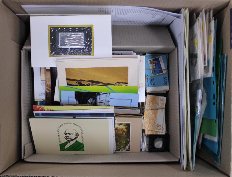 Carton with FDCs, Sigma covers, pre-stamped postcards, used Decimals, also booklets, presentation packs with face value $90+.