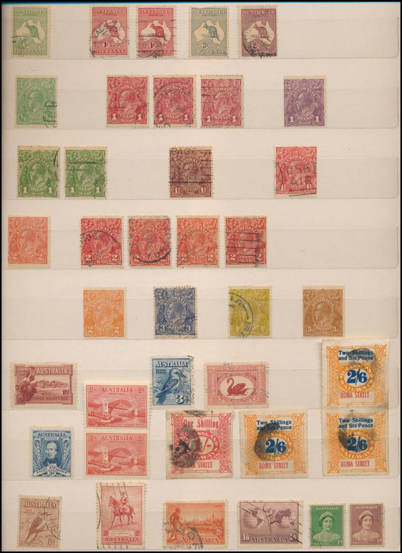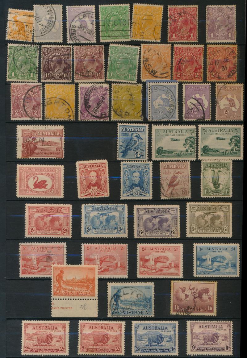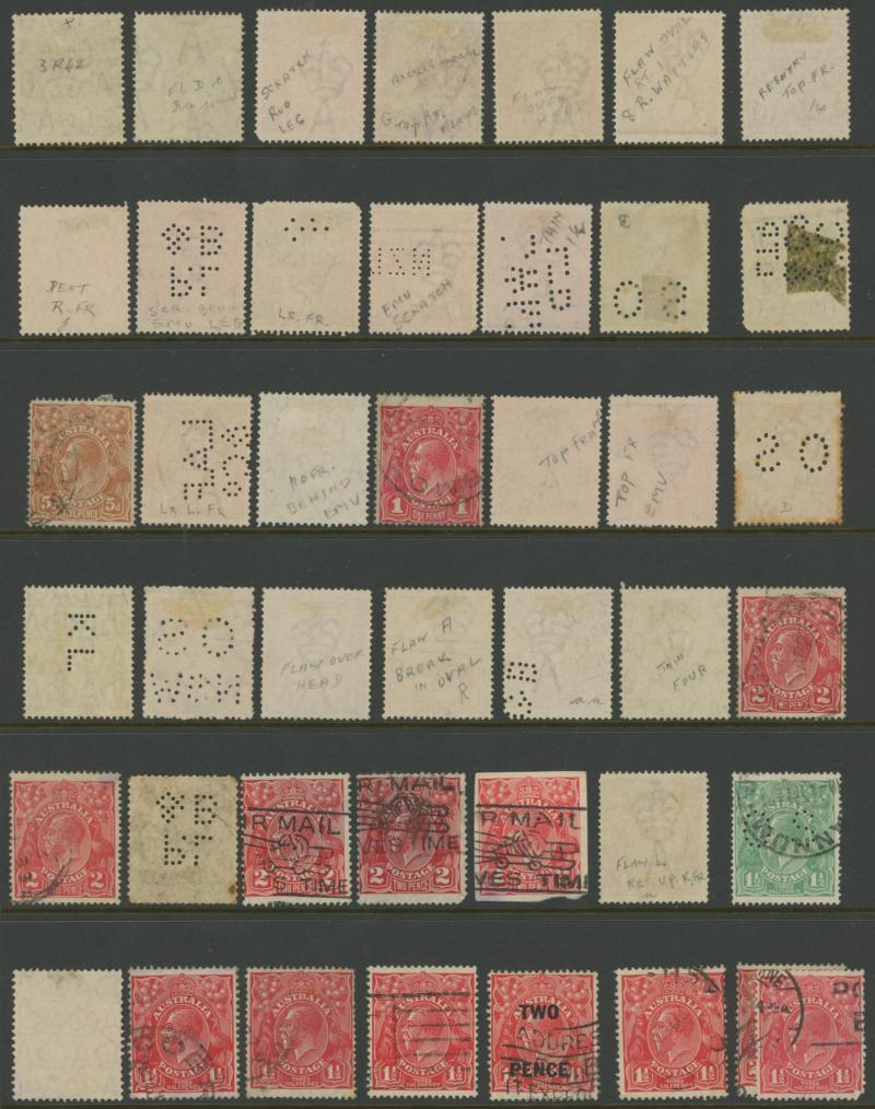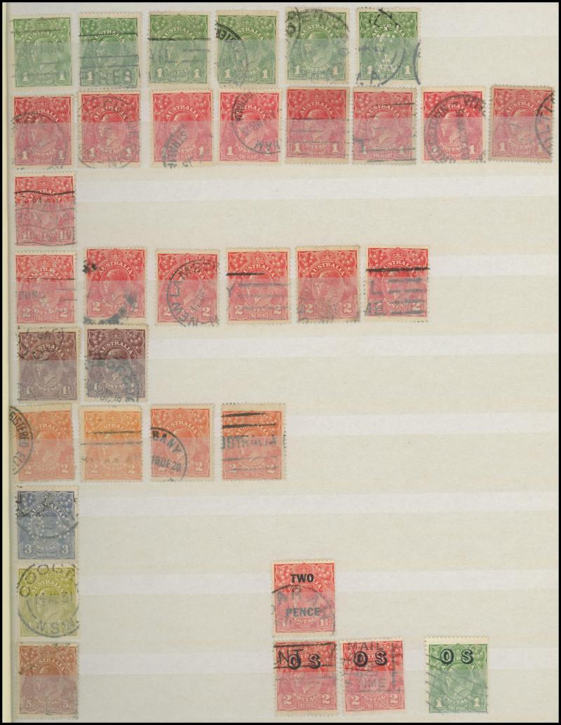 Pre-Decimals used including KGV private perfins, Harbour Bridge 5/- postally used, and Robes to £1; plus stockbook of KGV Heads 2d reds, some basic Worldwide, etc, condition variable.