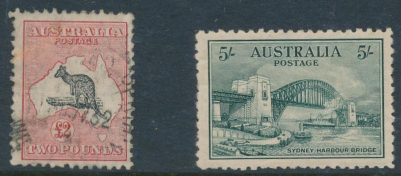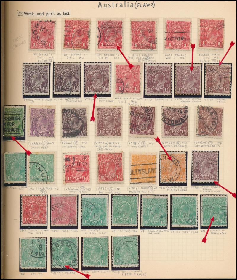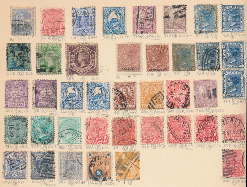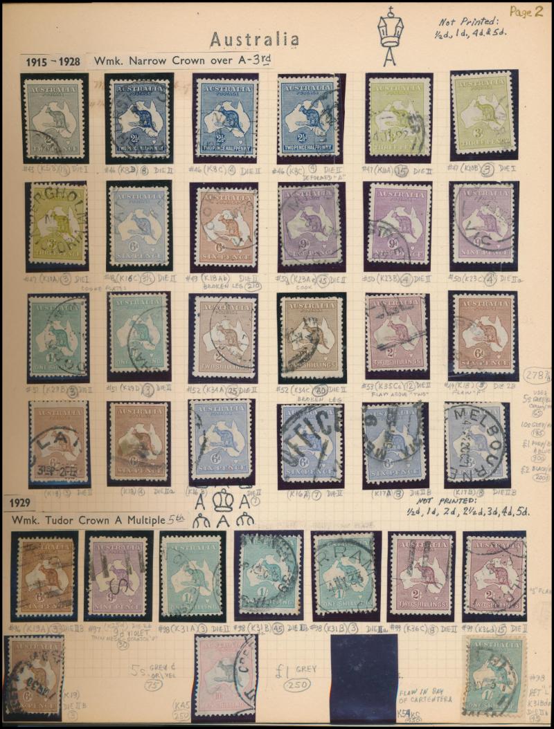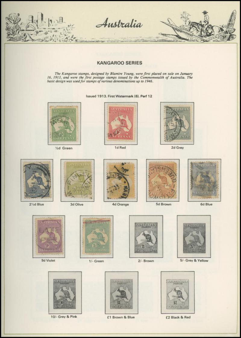 Basic collection starting from 1850s, including Kangaroos & KGV Heads varieties, 5/- Bridge with hinge thin, plus Pre-Decimal